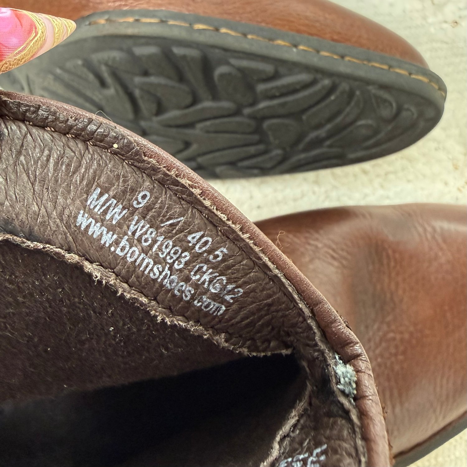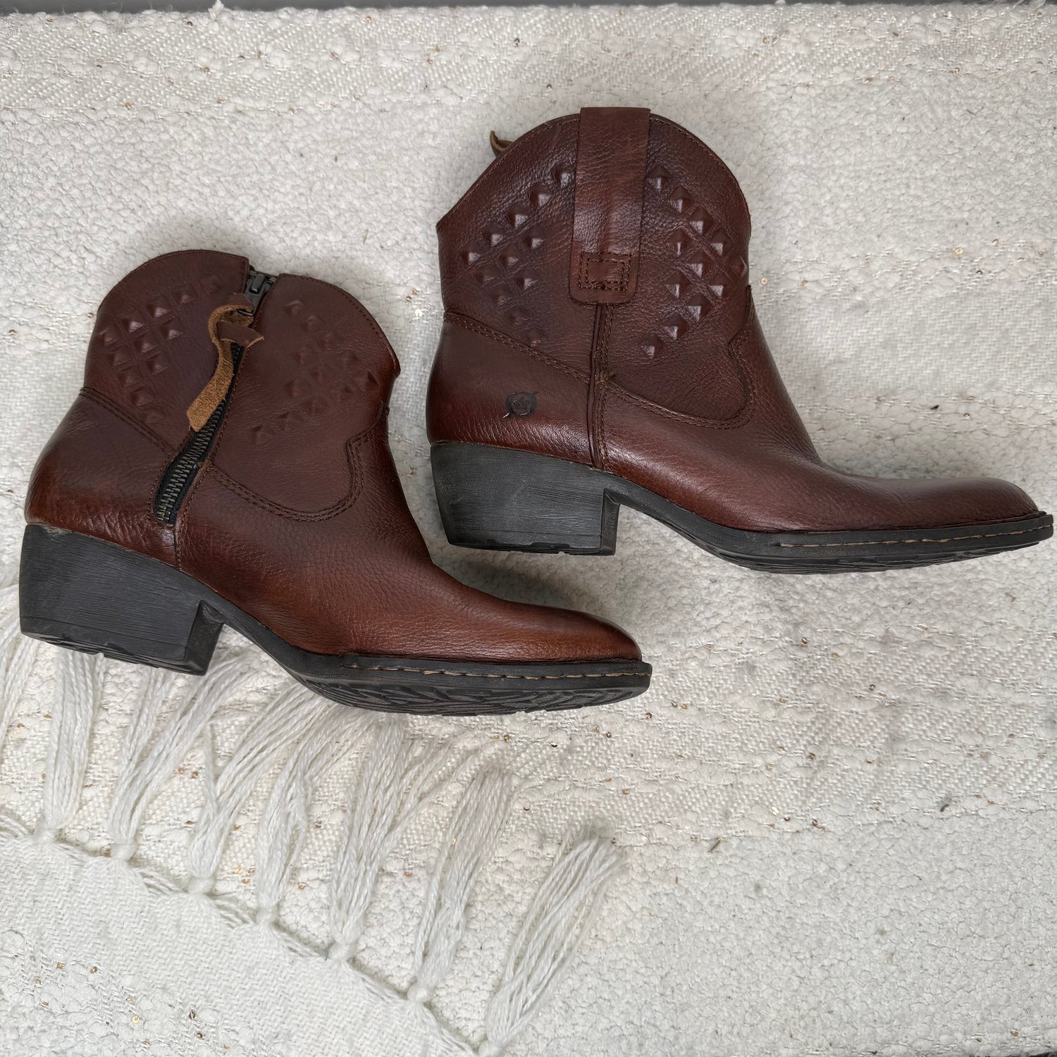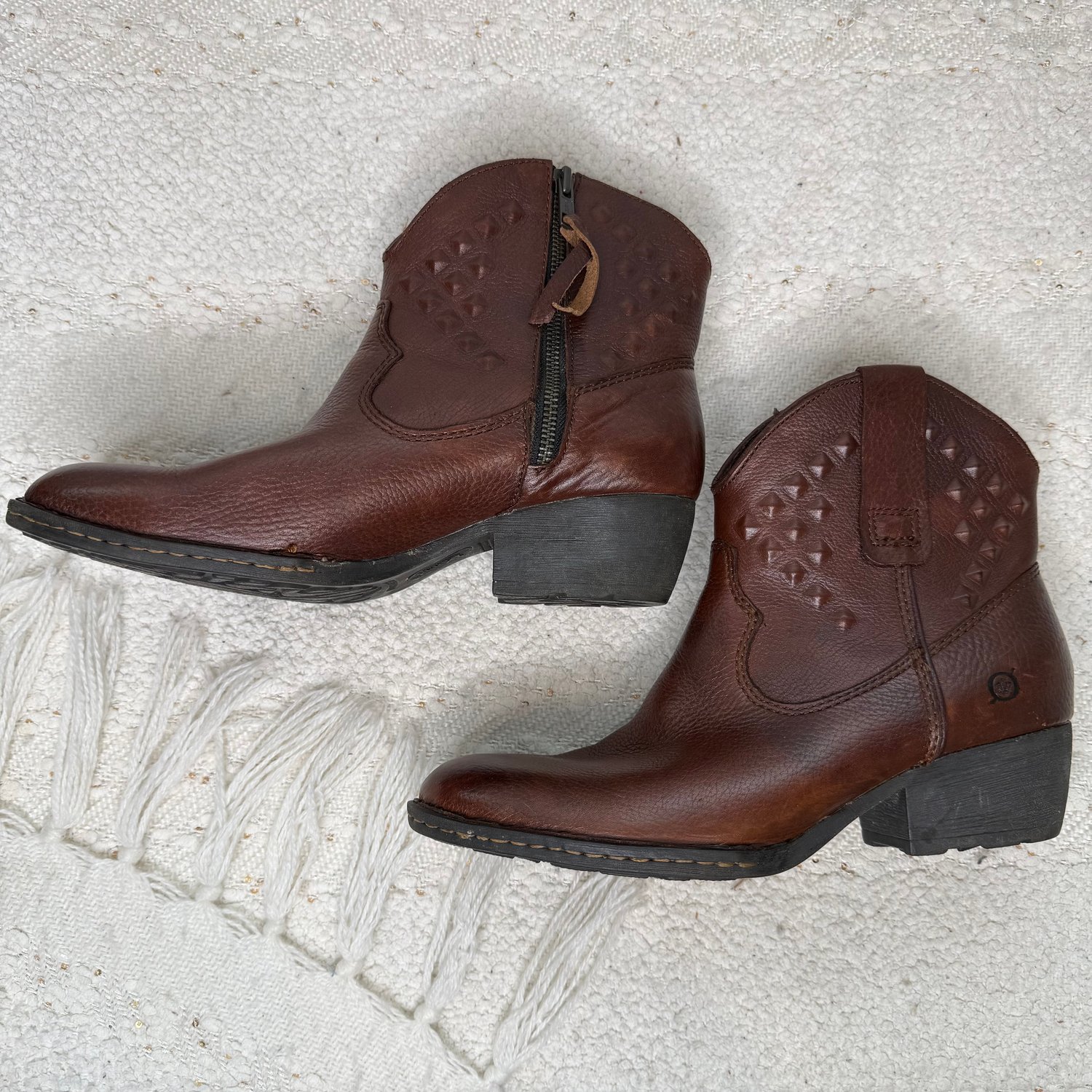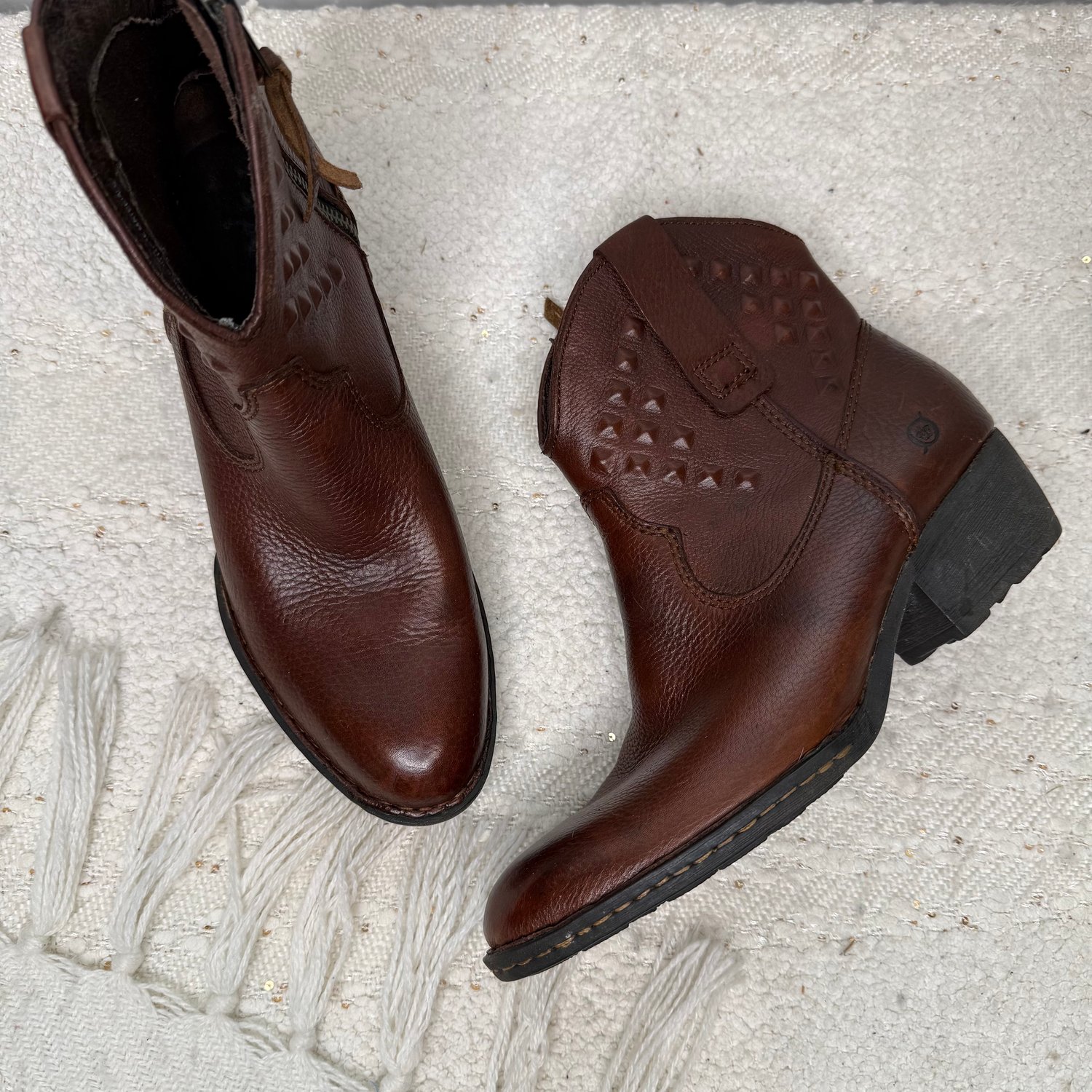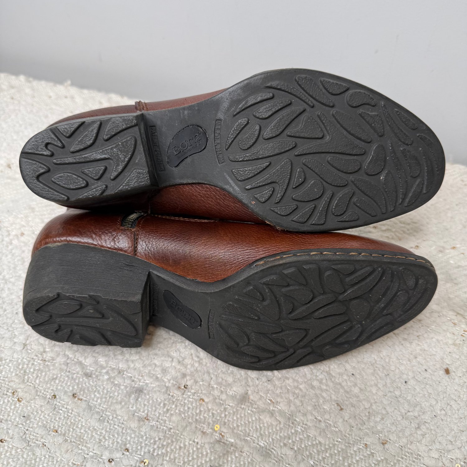 Born brown leather distressed ankle boots with inner side zipper closure and a medium height block heel.