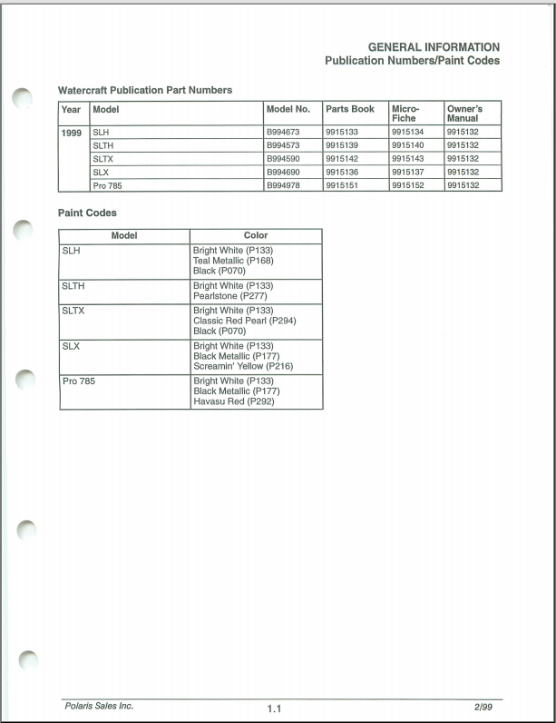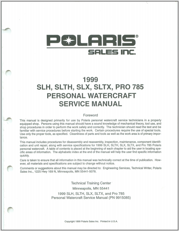 1999 Polaris SLH, SLTH, SLX, SLTX, PRO 785 Personal Watercraft Service Manual Part No. 9915085 .pdf download