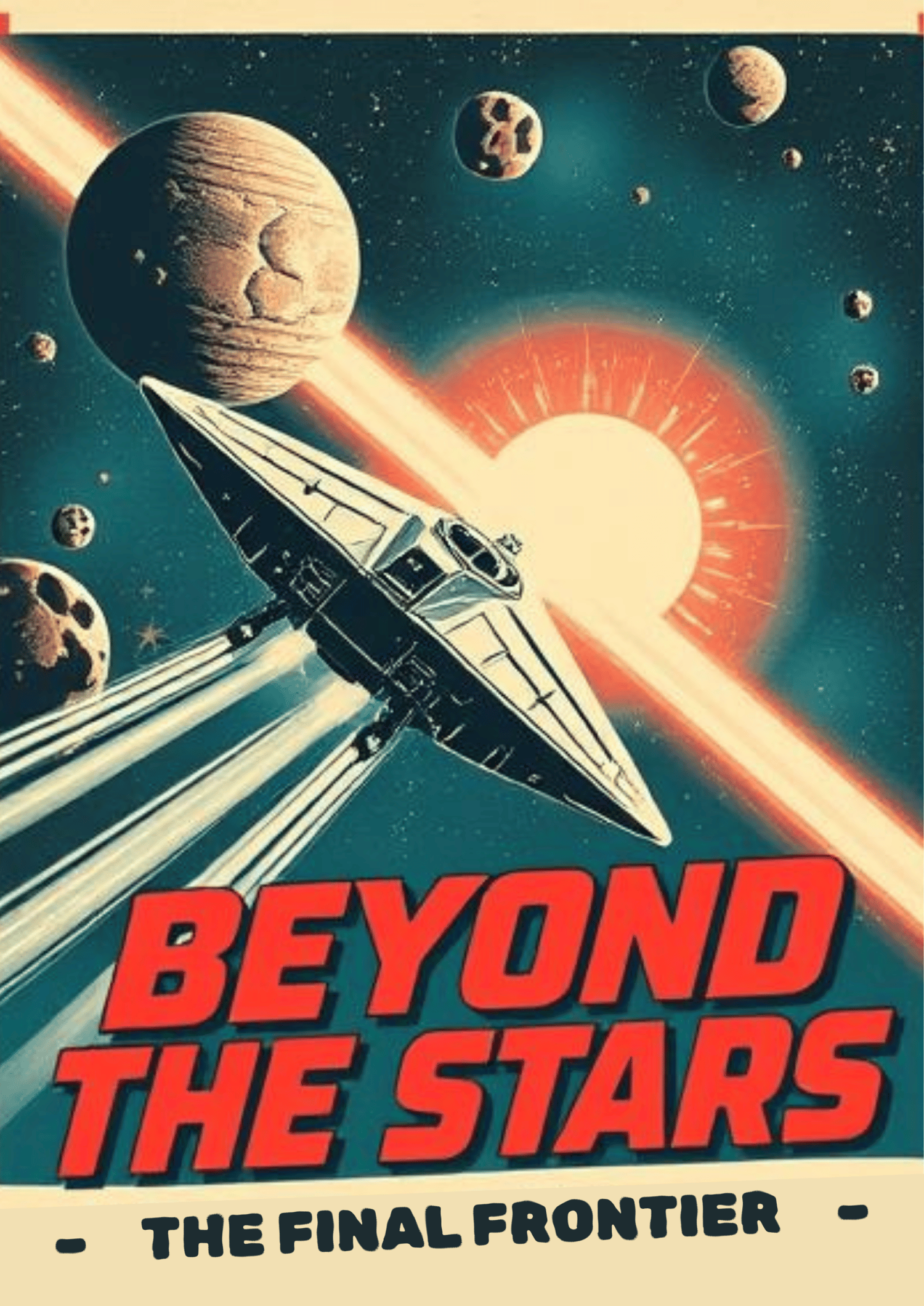 Take your space exploration dreams to new heights with this 1950s retro-style space adventure poster. Featuring a sleek spaceship zooming past glowing nebulae and distant stars, this high-quality print brings vintage sci-fi aesthetics into your home. The vibrant colors and bold fonts evoke a sense of wonder and excitement, perfect for any space enthusiast or retro art lover.