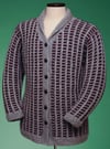 This cardigan is worked from the bottom up in pieces, then sewn together. The front bands/collar is worked separately, then sewn to the neck edge. Instructions are given for both a men's and a women's version. The color pattern is worked in mosaic knitting, where you work only 1 color at a time, changing colors every 2 rows.