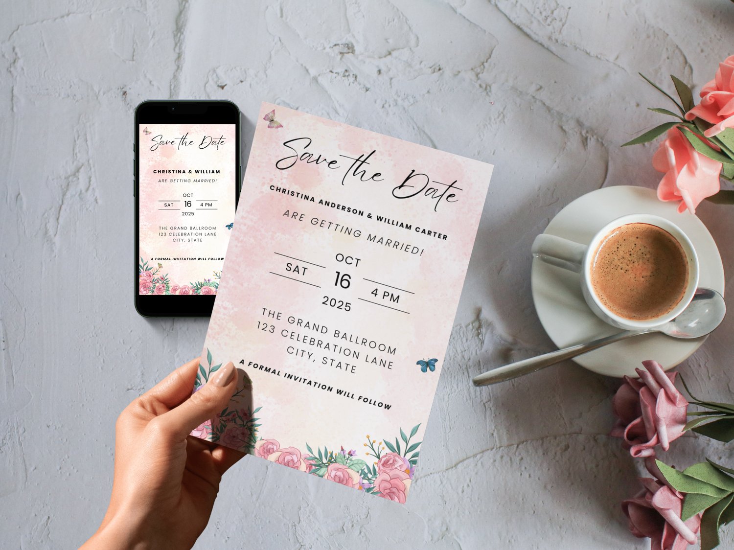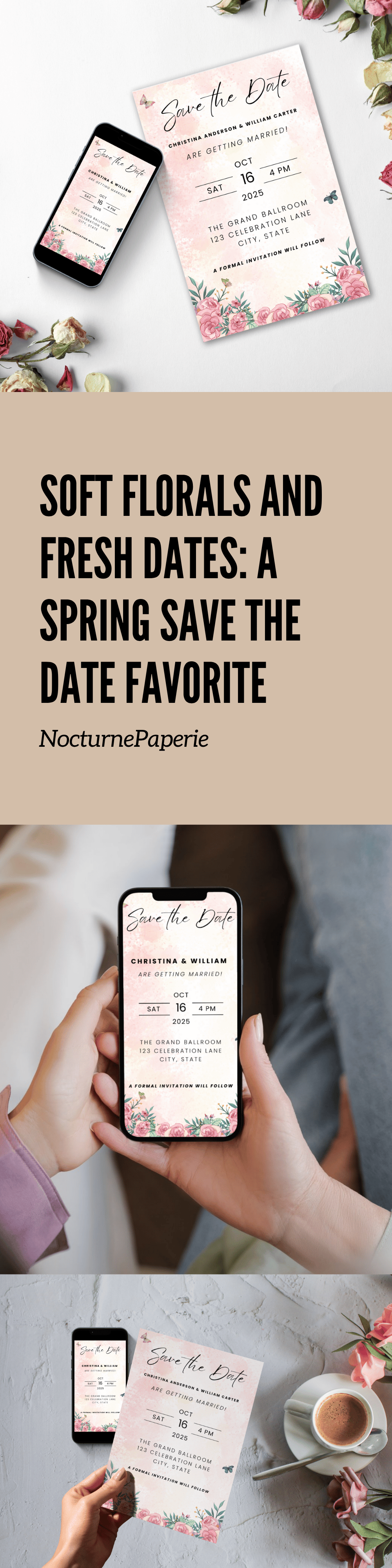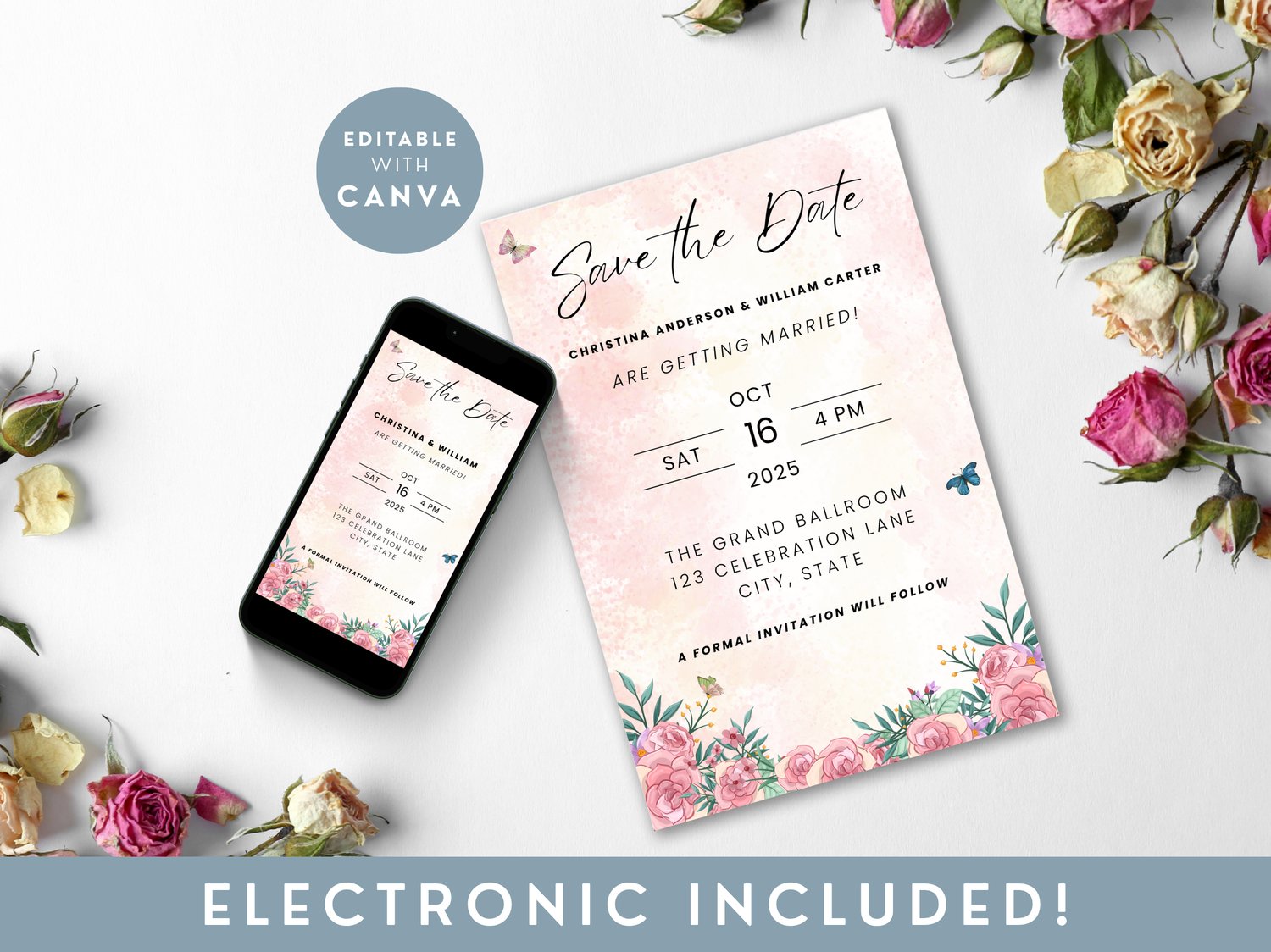 Set a romantic tone with this rose-themed Save The Date electronic wedding invitation. This pink floral editable Canva template offers a beautiful digital invite perfect for your wedding announcement. It’s part of our seasonal collection on NocturnePaperie—explore other seasons like Winter, Summer, and Autumn.