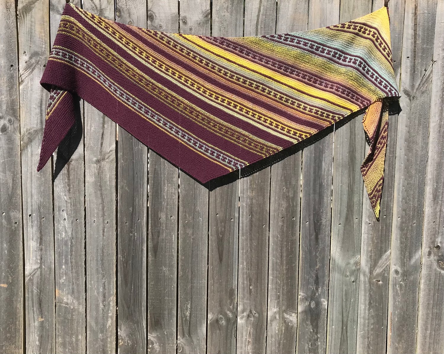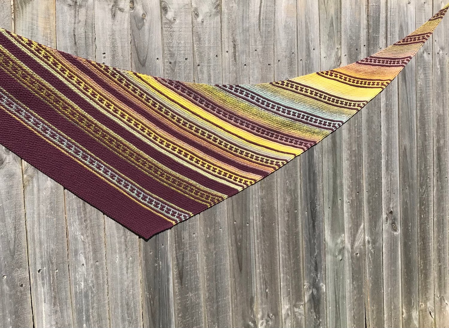 The Morph shawl is a garter stitch asymmetric triangle with stripes of slowly transitioning handspun colour contrasted by simple mosaic panels in a solid colour. An ombre effect is created as the contrast gradually takes over the body of the shawl and morphs into the dominant colour by the end. It is an easy and meditative knit that provides lots of visual colour interest as you relax your way through making a light and bouncy shawl you can wear every day.