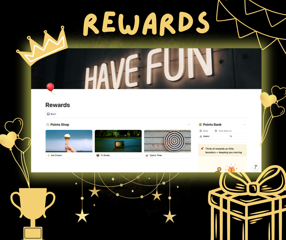 A flexible, motivating Notion system built for ADHD minds β structured, simple, and actually fun to use.