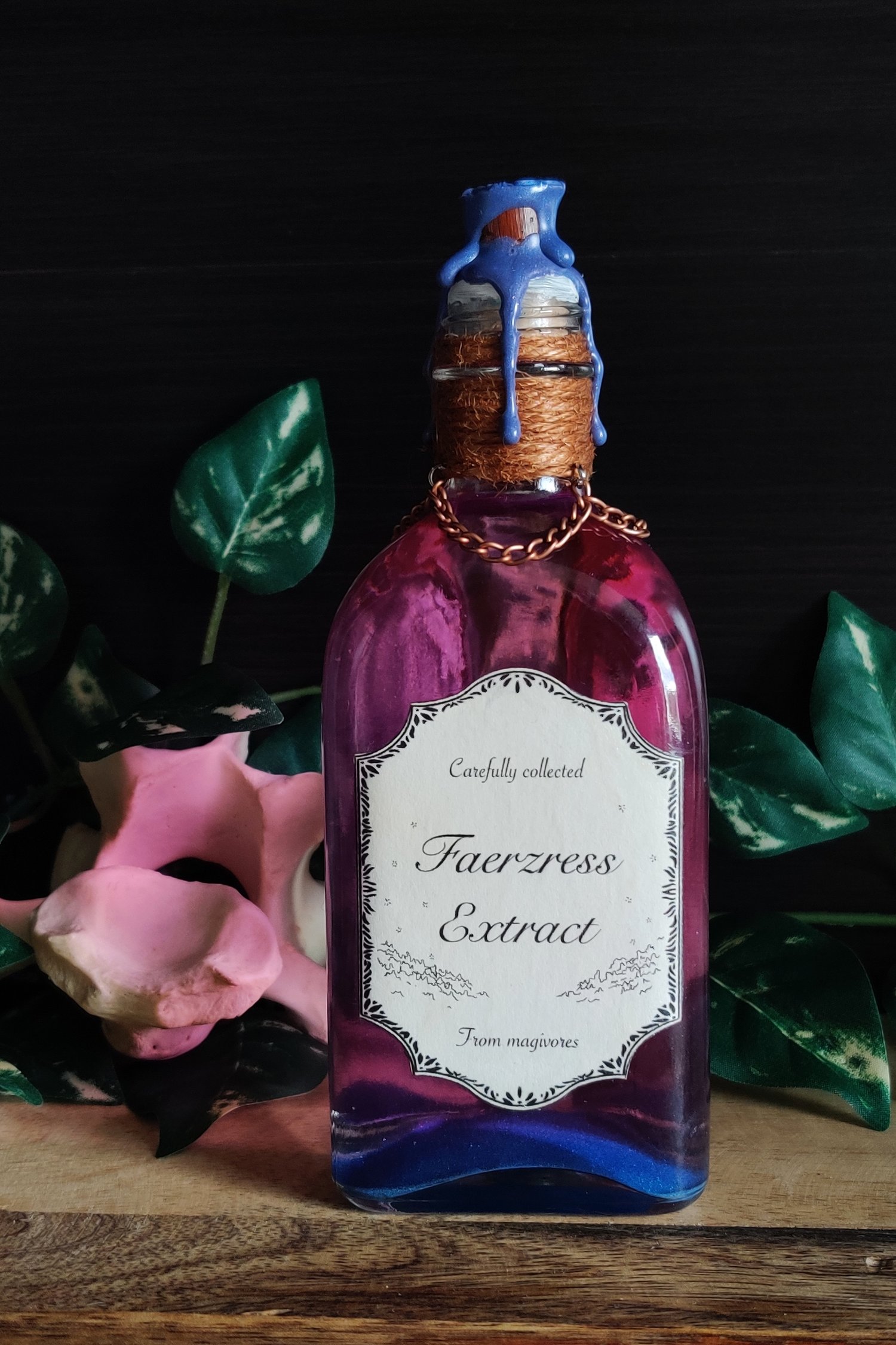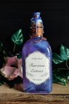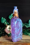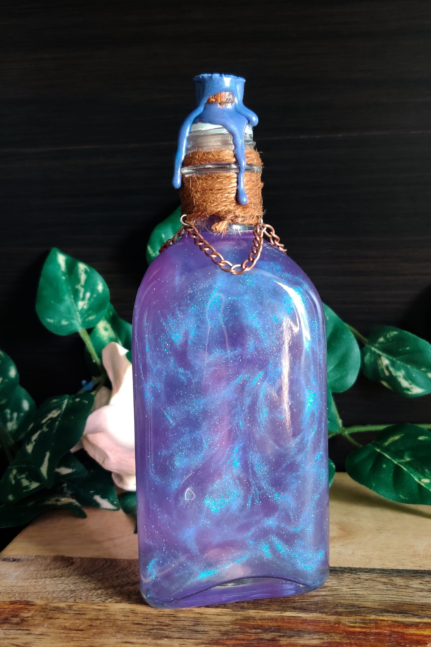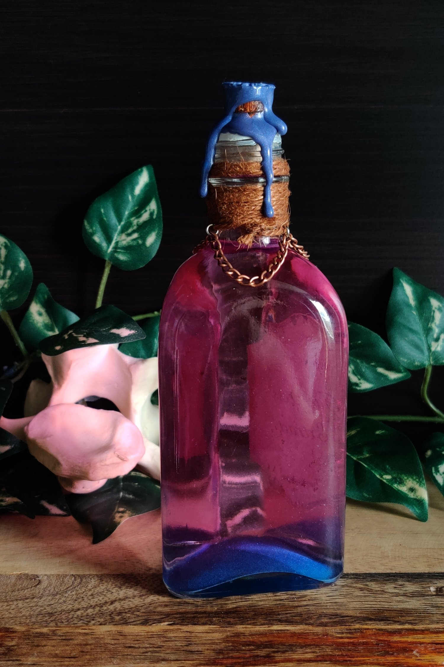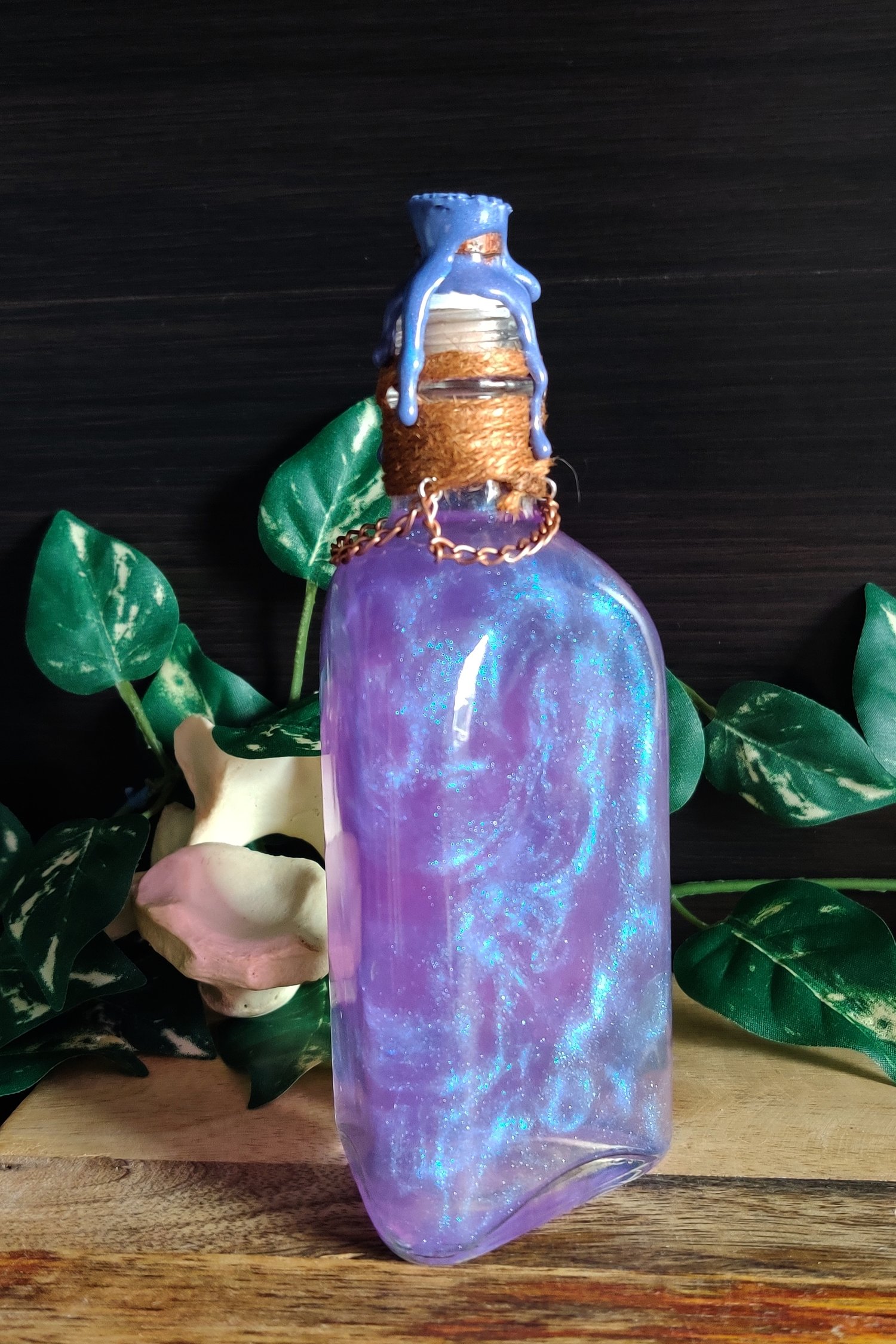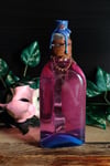 Pullossa on purppuran sävyistä nestettä ja se on koristeltu käsintehdyllä etiketillä, juuttinarulla sekä kupariketjulla.