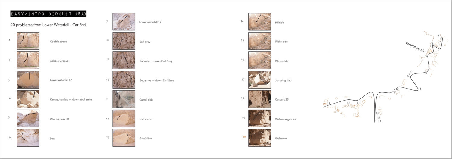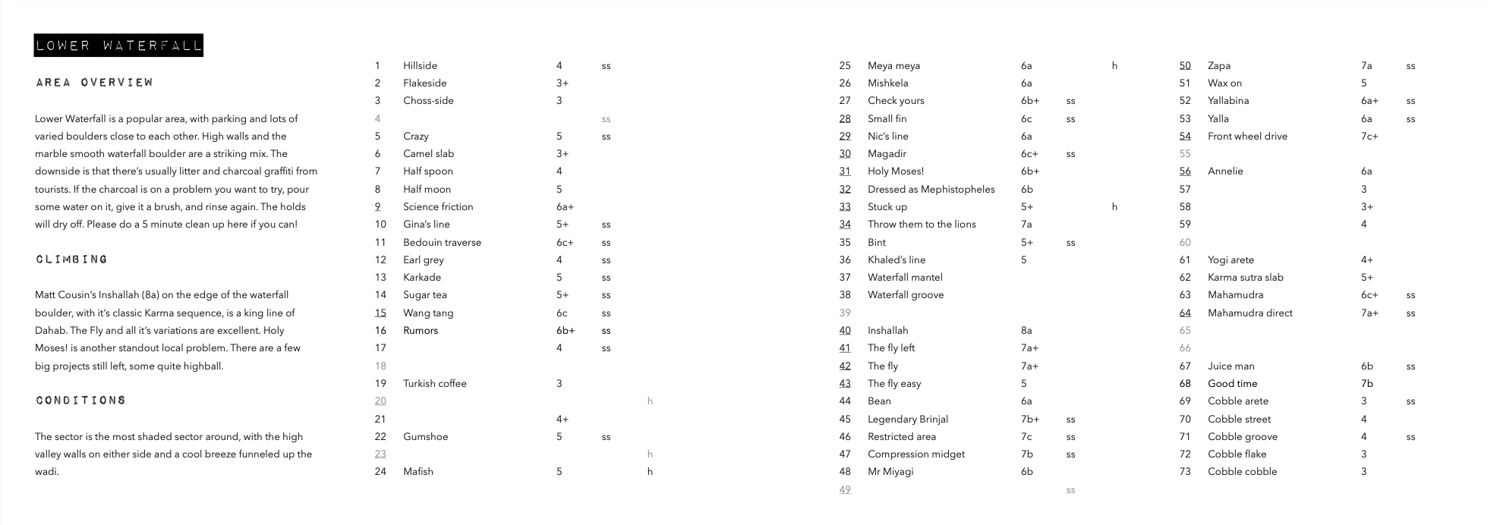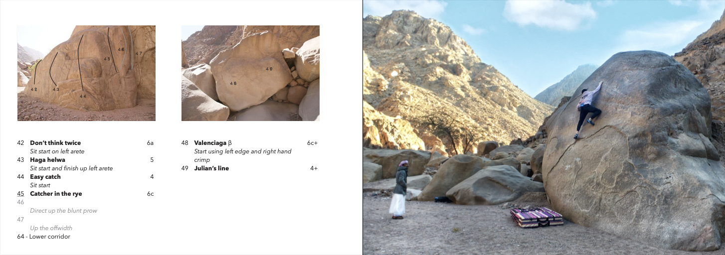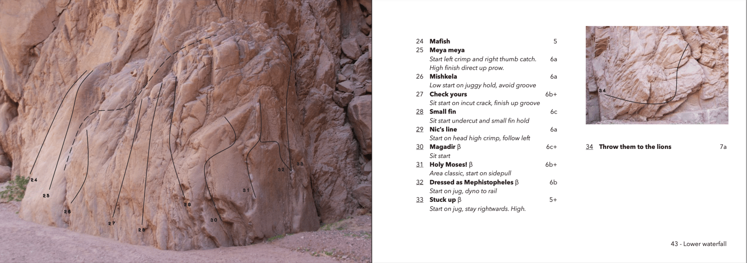 Pre-order at an early price of £30 instead of £35 now with delivery in December 2025 - Numbered (1-200) limited edition hardback guides to Wadi Gnai bouldering area in Dahab, Egypt. This collectors edition is the end result of 20 years work and is fully updated with new photos, additional problems, circuits & info. Approx 180 pages, full colour images, over 400 problems photographed. Guide to local area, travelling around, where to stay, there is even a basic arabic lesson included. Handprinted in the UK.