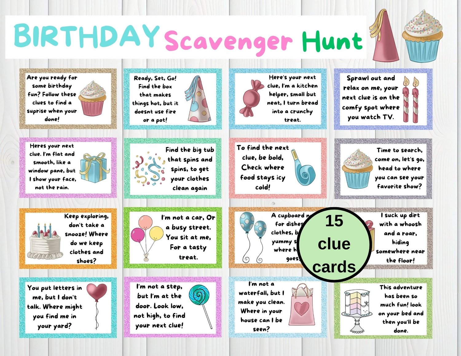 Make your kids' birthday extra fun with this birthday scavenger hunt. This birthday scavenger hunt printable includes 15 Clue Cards. The cards contain many common places such as Washing machine, Fridge, Sofa, Shower, Mailbox, etc. I’ve also included blank cards that you can add text to in canva or write on and make your own clues if you have a place in mind that i have not made a clue card for.