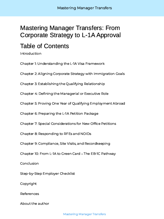 Mastering Manager Transfers is an essential guide for U.S. businesses navigating the complexities of the L‑1A visa process, ensuring a strategic alignment between corporate objectives and immigration goals. This comprehensive resource covers everything from establishing qualifying relationships and drafting job descriptions to preparing petition packages and responding to USCIS inquiries. With practical insights and detailed checklists, it empowers employers to effectively transfer key managers and executives, facilitating growth and leadership continuity in the competitive U.S. market.