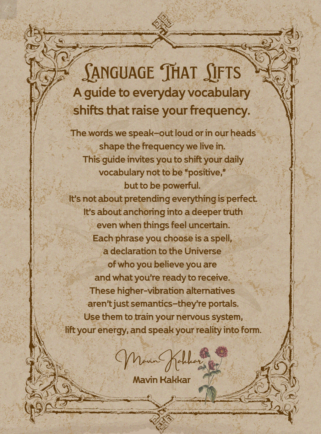 Your words shape your world. Language That Lifts is a vibrational reframe guide that helps you swap everyday phrases for high-frequency alternatives—so you’re not just speaking differently, you’re living differently.