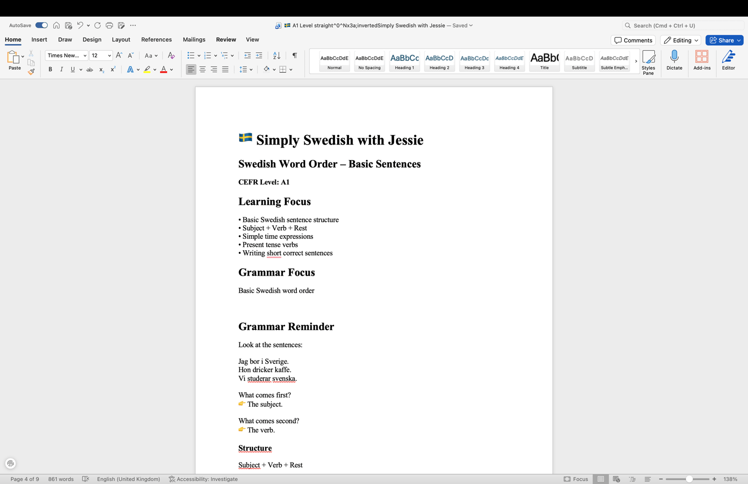 Swedish Worder order straight/inverted A1l evel