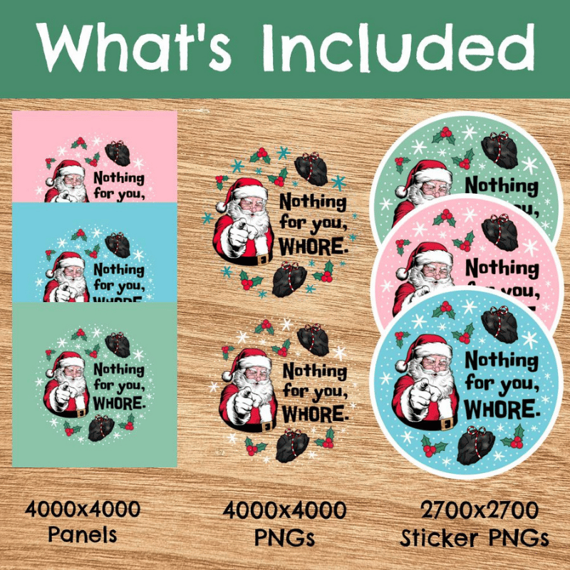 Naughty Santa sweary graphics for stickers, badge reels, jar and candle labels, uv dtf transfers, shirts, digital journals, gift tags and so much more!