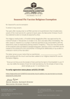 If you have any questions please contact us through email - not through the verification line. If your exemption review process requires a personalized letter from the church, contact us and we will issue it at no cost. However, we will not open digital documents furnished by any organization outside of the church (e.g., your employer, school, etc...) and fill them out for you.