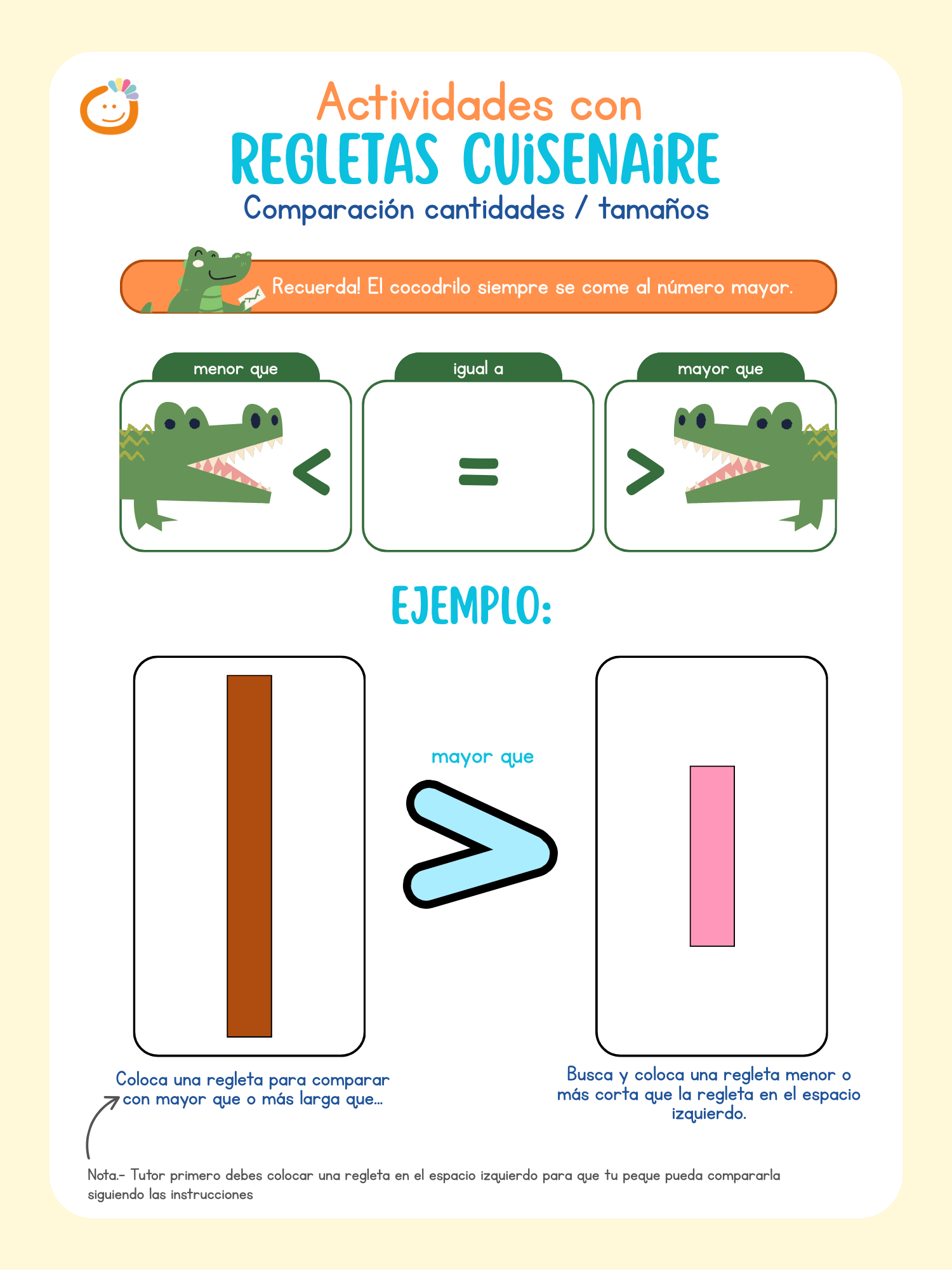 Recomendación: Imprimir, plastificar algunas páginas para reutilizar y acompañar con un set físico de regletas Cuisenaire.