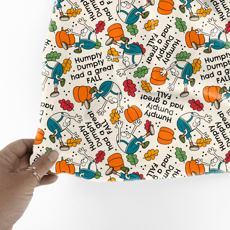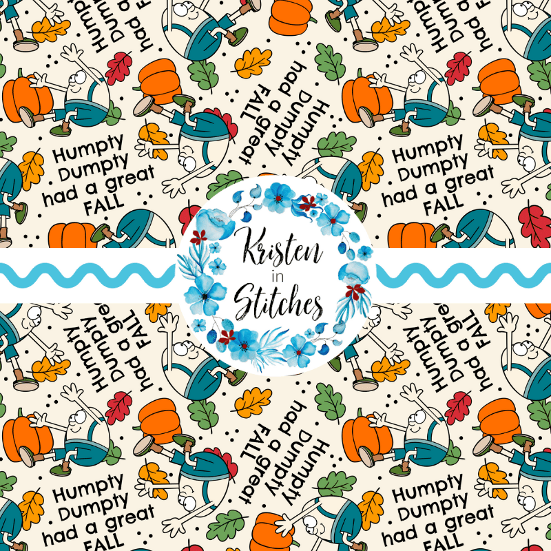 Humpty Dumpty had a great fall, with pumpkins and autumn leaves on ivory.