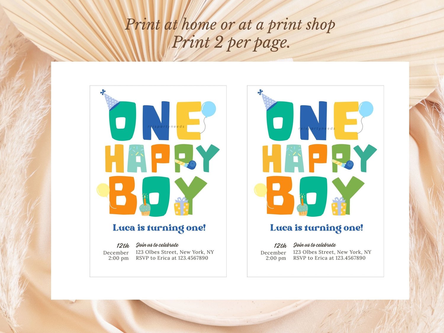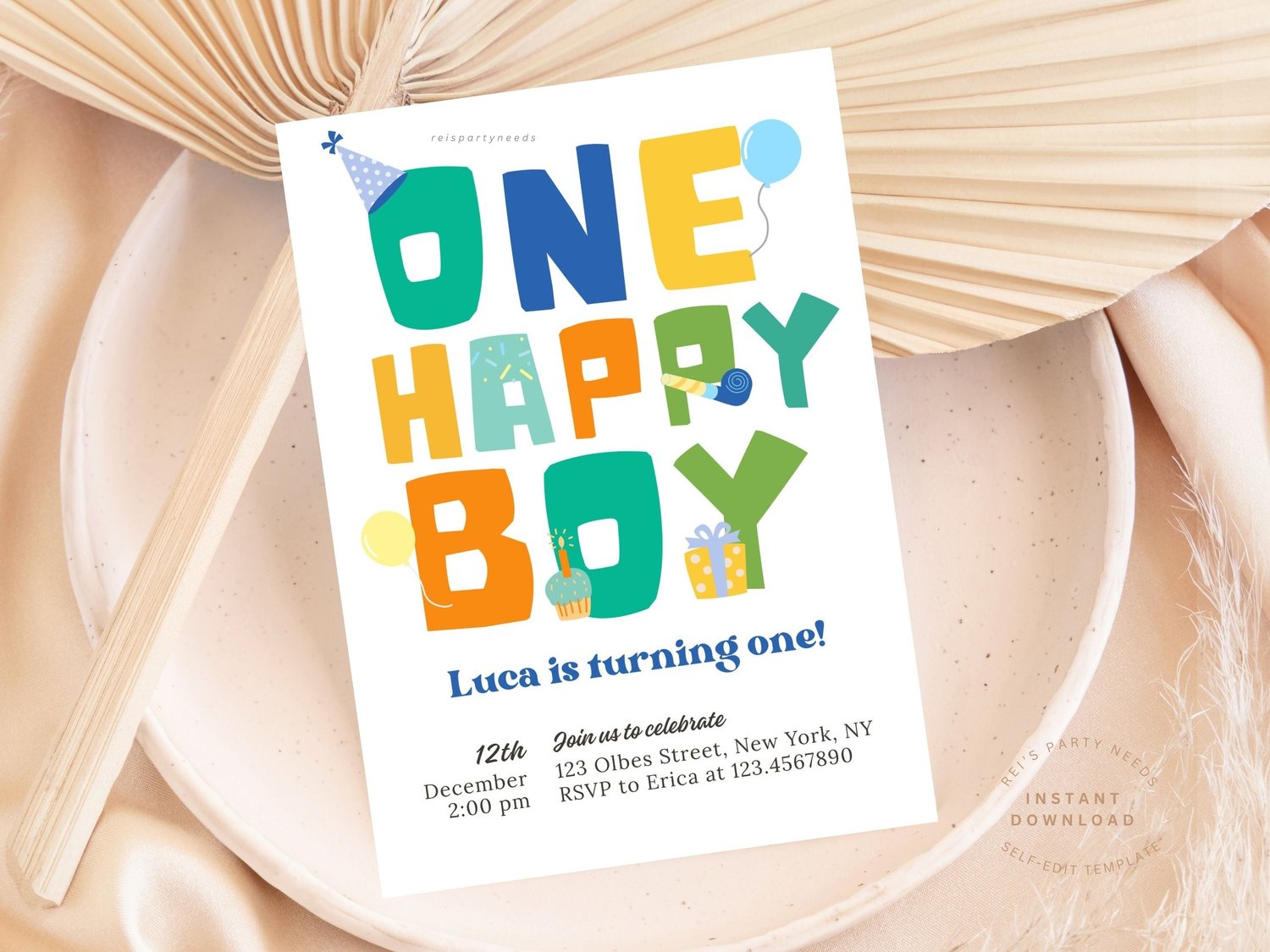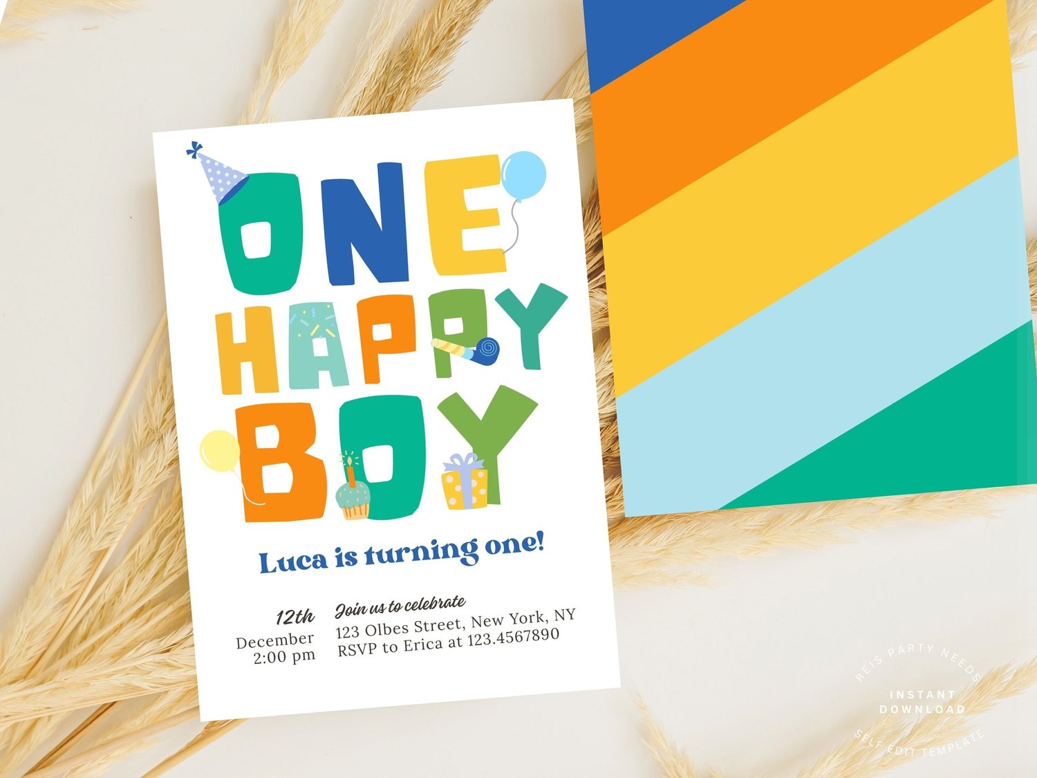 One Happy Boy First Birthday Invitation, Editable 1st Birthday Party Invite, Boy First Birthday Cake and Balloons, Instant Digital Download