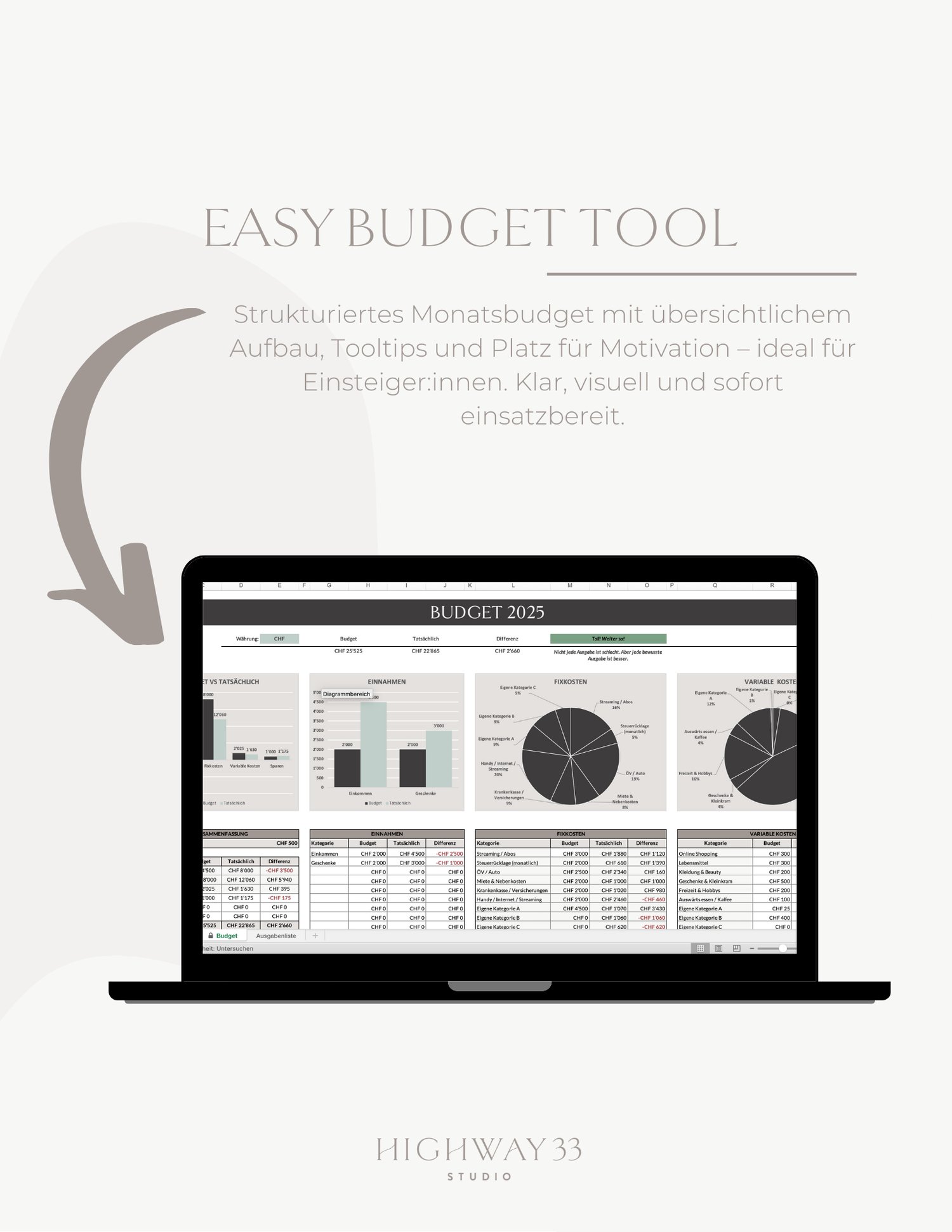 Einfach zu verstehen, ohne komplizierte Formeln. Monatsübersicht mit smarter Struktur, Tooltips & Platz für Motivation