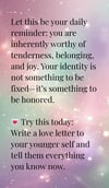 Each of the 30 cards in this printable deck is a vibrant reminder that your identity is sacred, your joy is protest, and your weird is your wonder. Fronts feature bold, affirming truths. Backs hold poetic prompts and playful questions that spark inner work, self-love, and rebellion.