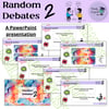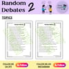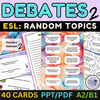 This product includes 40 random debate topics which can be used as speaking or writing prompts for ELA and ESL learners. It includes topics such as: everyday activities, sports, hobbies, school, friends, culture, travelling, English, and more!