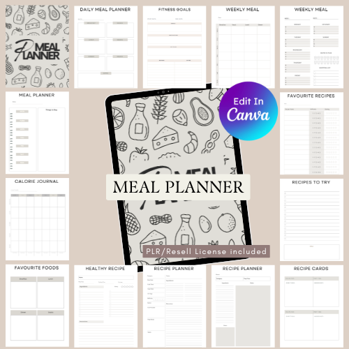 Weekly menus, grocery lists, macro tracking, budget-friendly meal prep pages.
