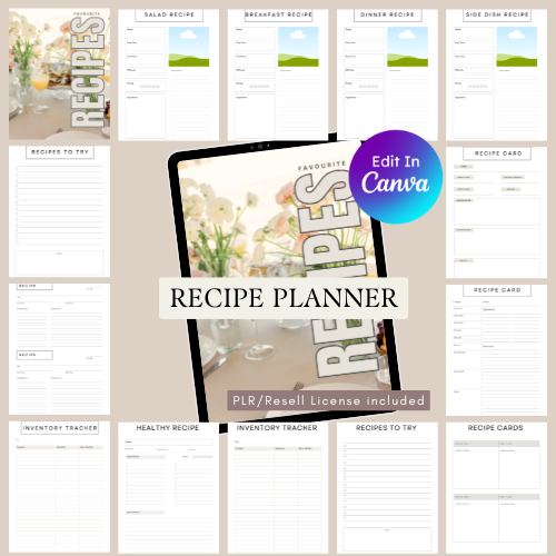 Recipe templates, cooking notes, ingredient lists, family favourites & kitchen organization pages.