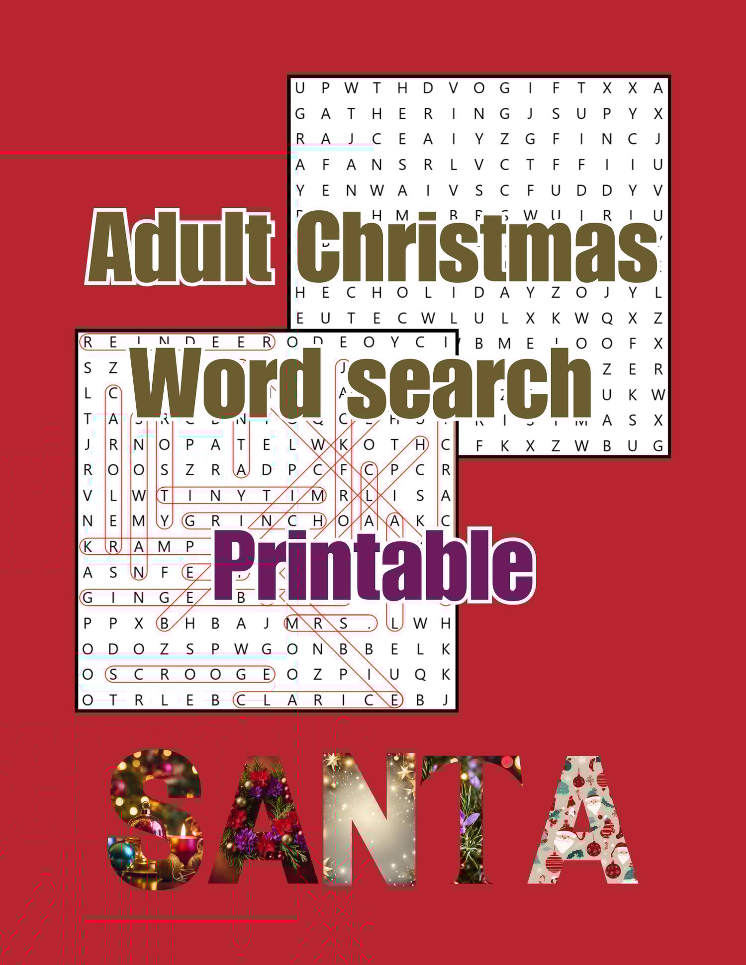 Christmas word search book for adults in large print. A fun and festive word puzzle with Christmas-themed word find puzzles designed to challenge your mind while providing hours of entertainment.