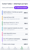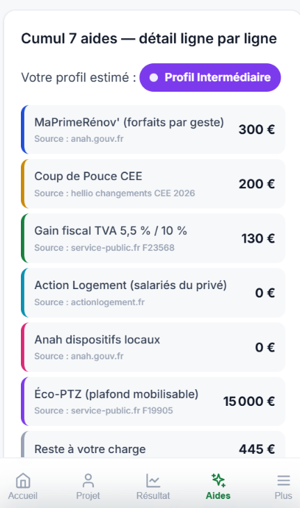 - Cumul automatique des 7 aides dans un graphique unique : MaPrimeRénov' (4 profils Bleu / Jaune / Violet / Rose détectés automatiquement selon votre revenu fiscal), CEE Coup de Pouce, éco-PTZ, TVA à 5,5 %, Action Logement, Anah, reste à charge