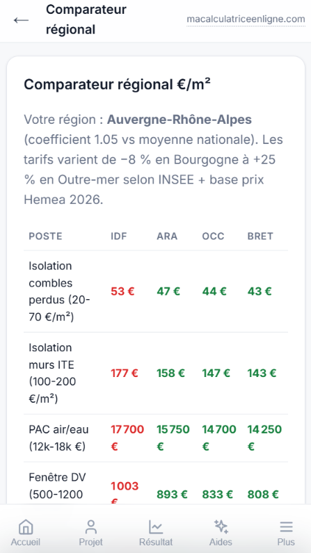 - Budget travaux en fourchette basse / haute ajusté à votre région (coefficient de +18 % en Île-de-France à −8 % en Bourgogne, source Hemea + INSEE 2026)