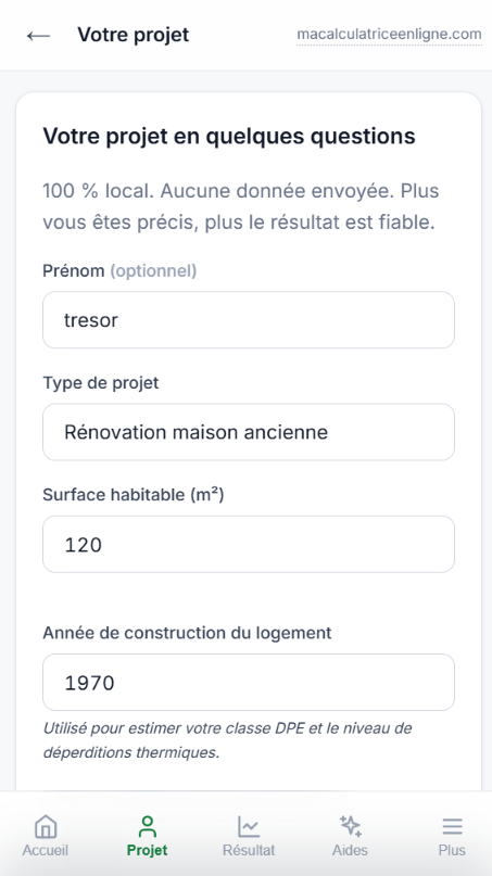 Vous êtes propriétaire d'une maison à rénover (isolation, pompe à chaleur, fenêtres), primo-accédant dans le neuf, ou simplement curieux de savoir combien vos travaux vont vraiment vous coûter après cumul de toutes les aides publiques ? Cette application est faite pour vous.