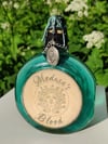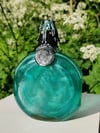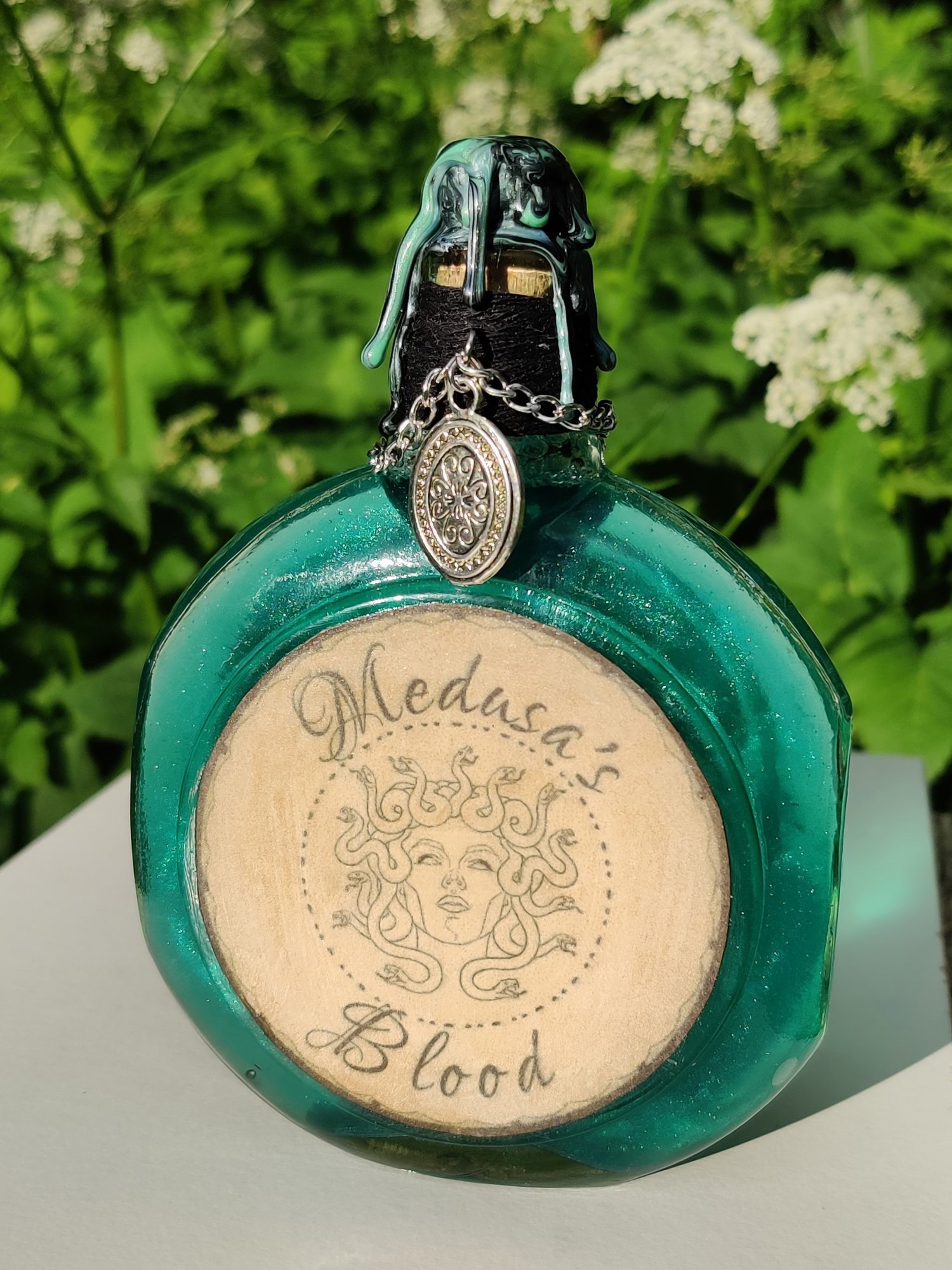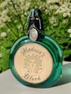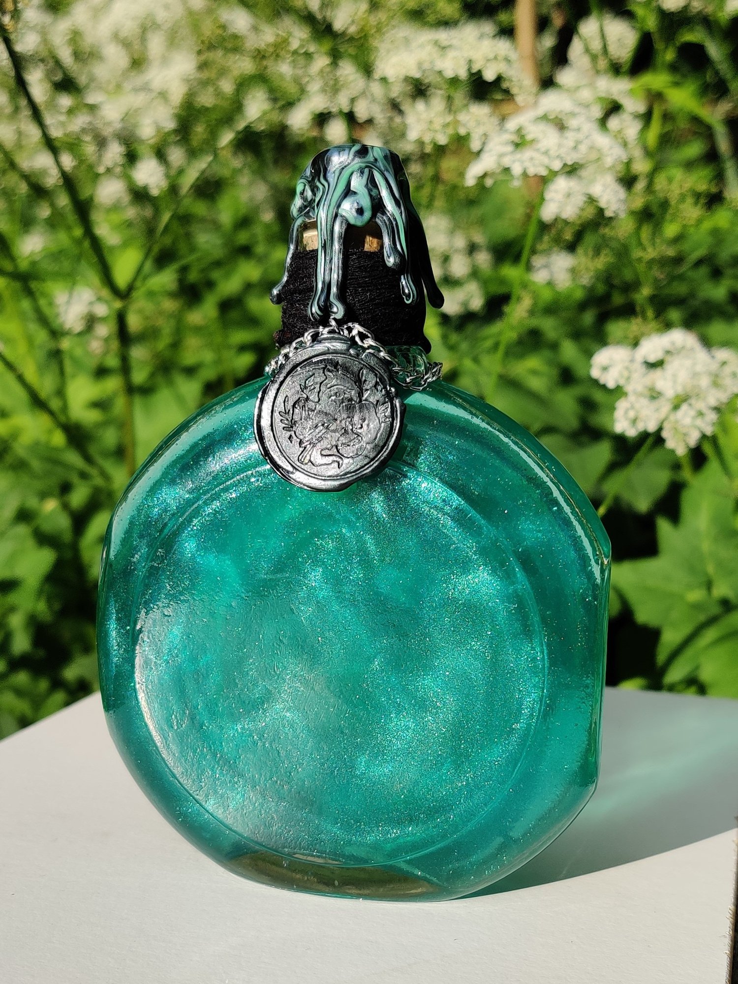 Pullossa on sinivihreää nestettä ja se on koristeltu käsintehdyllä etiketillä, narulla sekä ketjulla ja riipuksella.