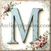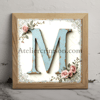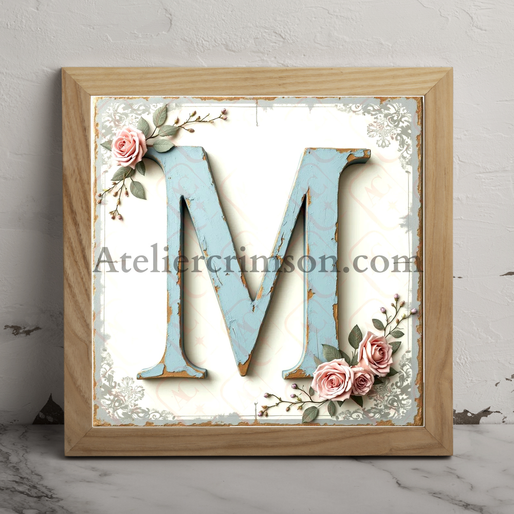 The letter M shabby chic blue a work of art in soft pastel blue. These elegant characters, reminiscent of weathered painted wood, stand out against a delicate off-white background with subtle floral accents. Perfect for vintage-inspired home decor, DIY projects, or creating unique, personalized gifts with a touch of timeless elegance.