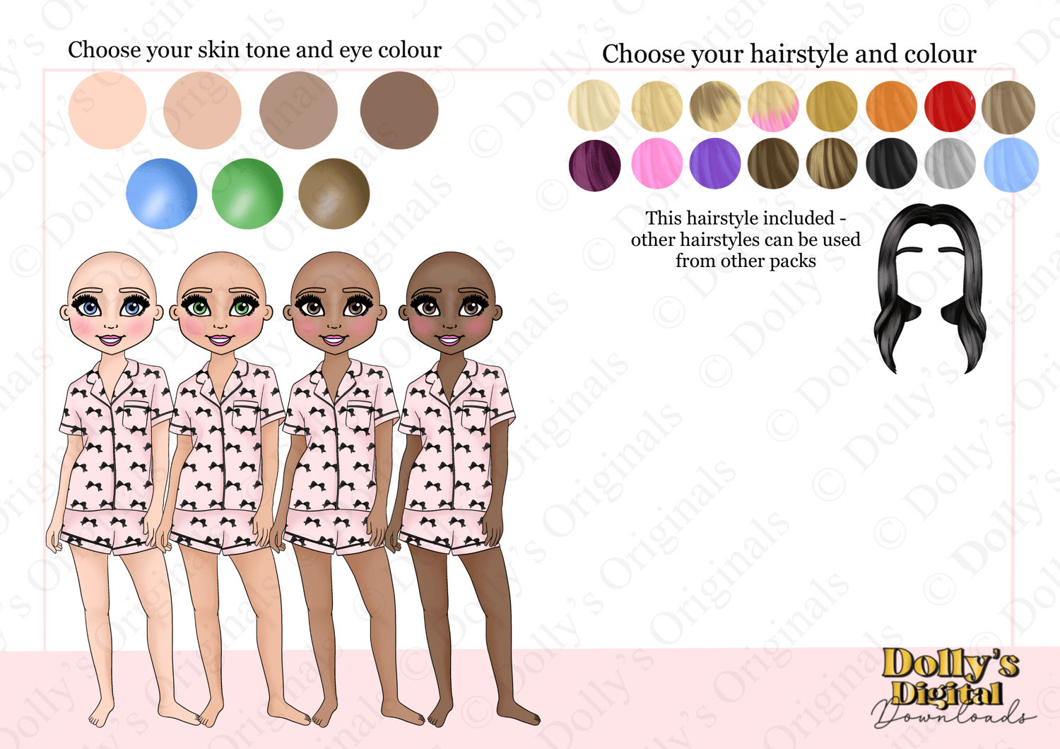 Instant digital download of our Pink and Black Bow Short Pyjamas Doll Character Bundle PNG (32 PNG’s)