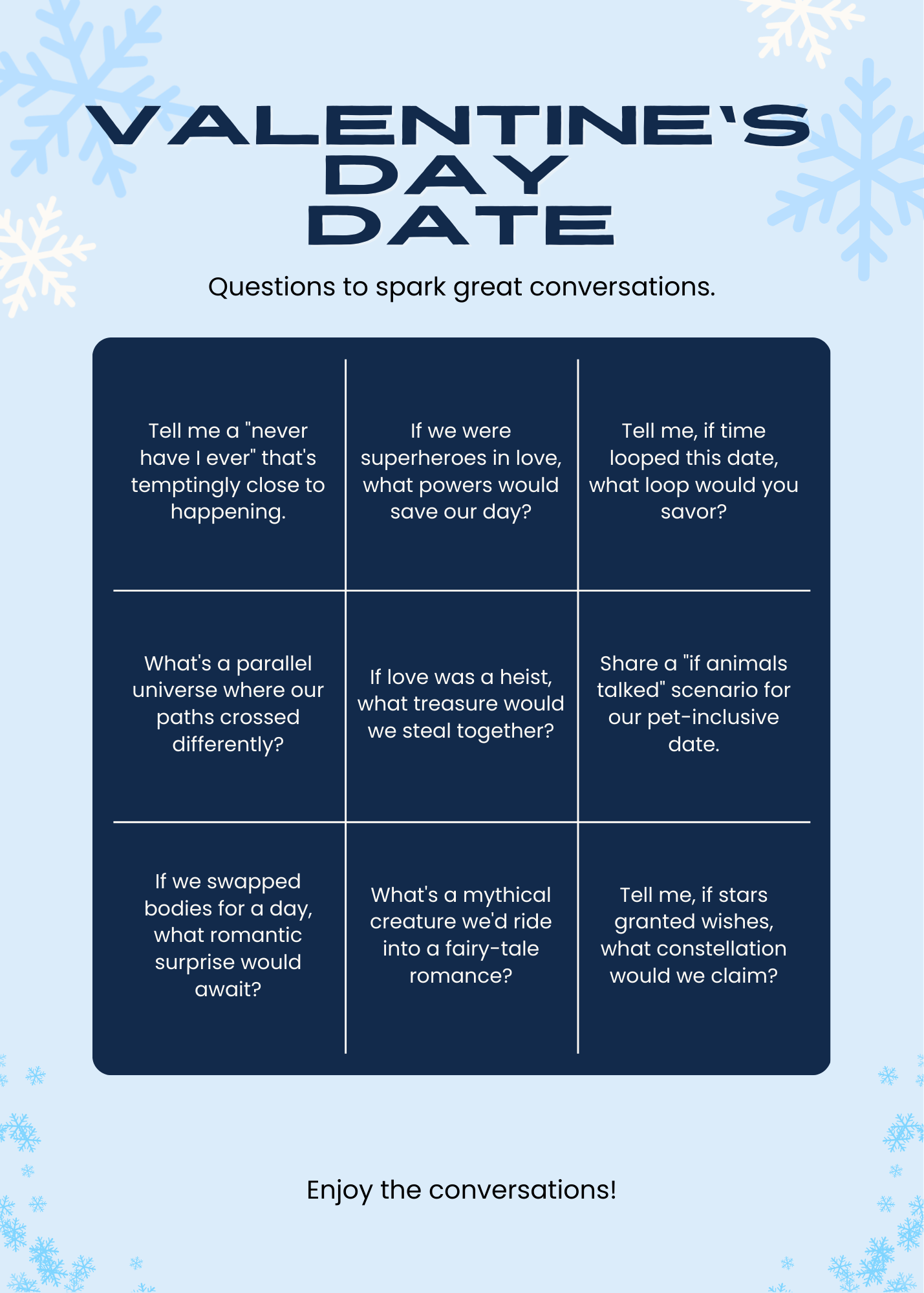 198 questions to spark, fun, deep and flirty conversations with your Valentine's Day date. These questions can also be used on day to day dates.
