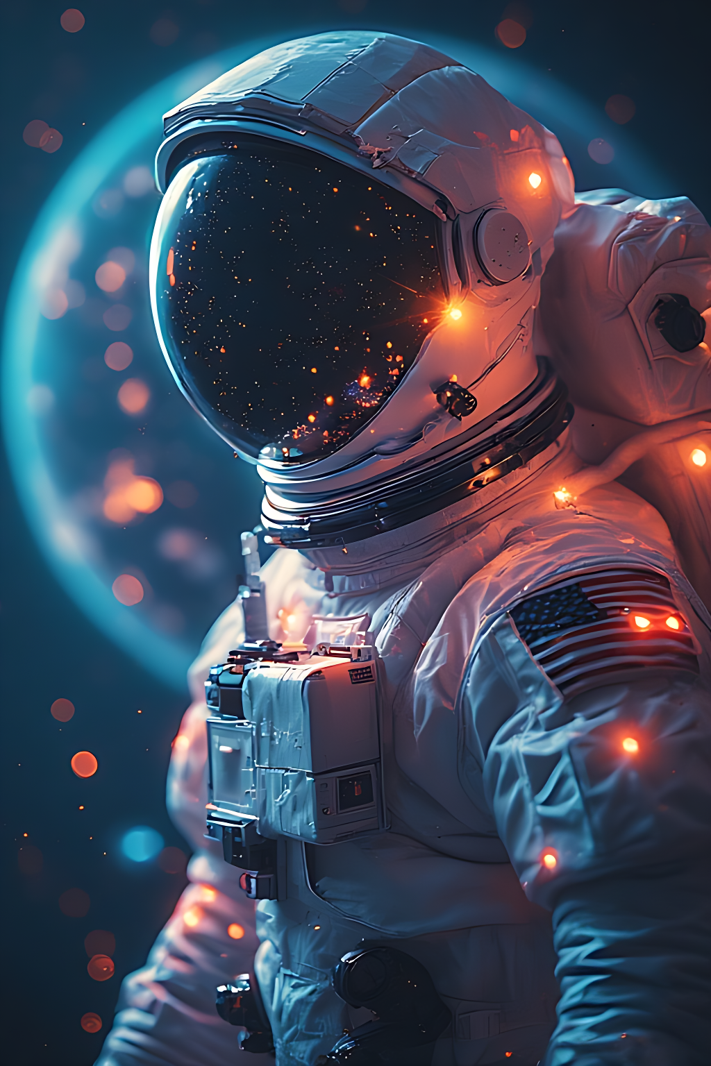An astronaut wearing a white spacesuit with the American flag on the shoulder is depicted against a backdrop of nebulous colors and bokeh lights. The astronaut's visor reflects a field of stars, suggesting a vast and unexplored universe.