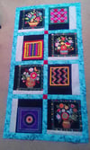 If you’re looking for a quick and easy tablerunner or wallhanging, give this one a try. Eight blocks with sashing and cornerstones, add a border, quilt, bind, and it’s done! Diagrams for layouts using directional fabric are included. You can hang this on the wall, lay it on a table, or even use it as a bedrunner. You can add more blocks to make it longer, or, as one of my testers did, add blocks to make it wider for a quilt.