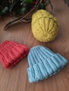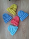 Méretek: a bordás mintának köszönhetően rugalmas darabot kapunk, a méretek univerzálisak, akár több fejkerületet is átfognak, ezért 3 méretben készülnek: 22-23, (24-26), 27-30 cm-es fejbőségre megfelelőek.