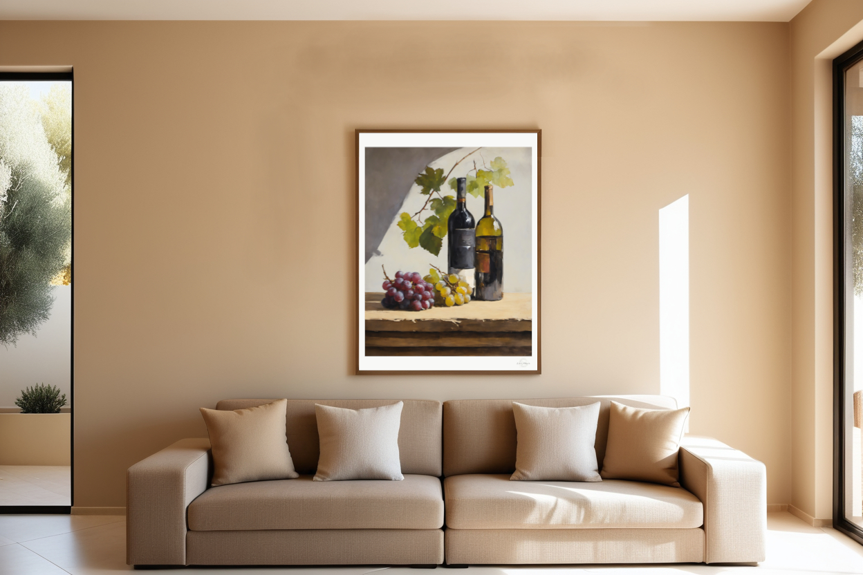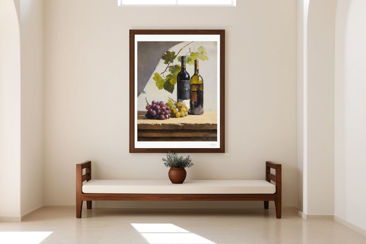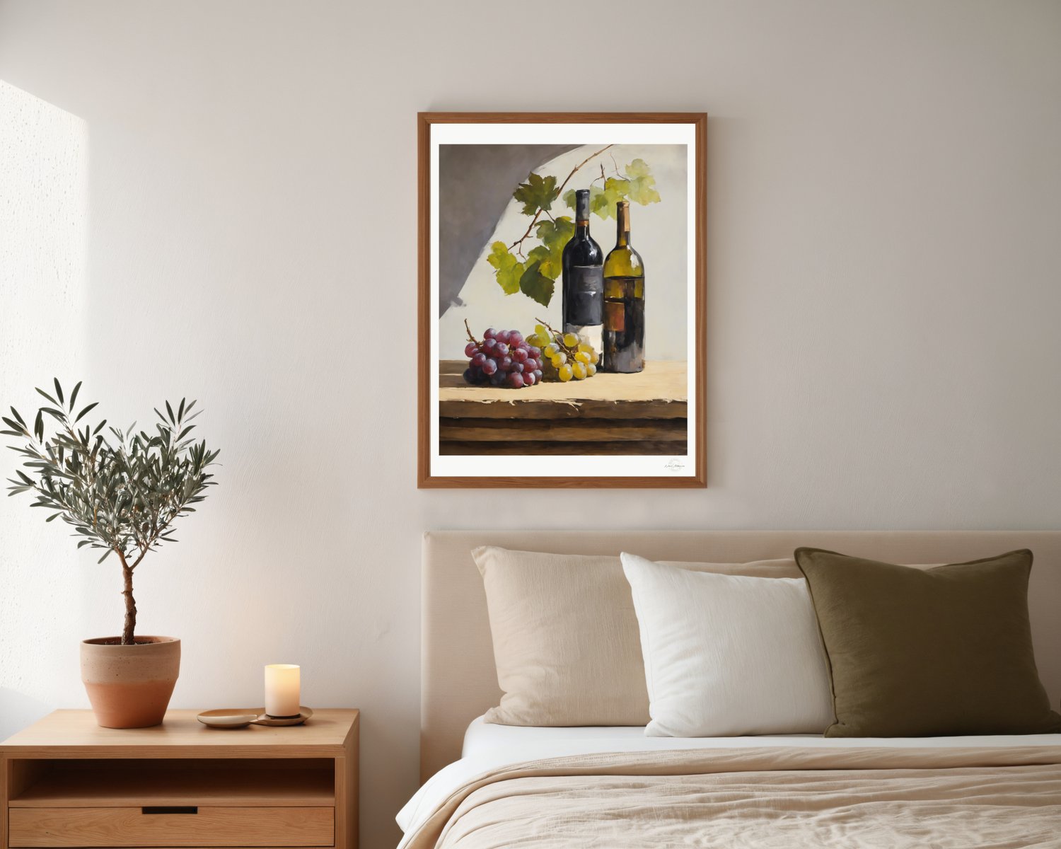 A warm still life composition with wine and grapes, captured in soft natural light. A balanced piece that brings subtle color and calm to kitchen and dining spaces.