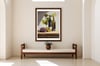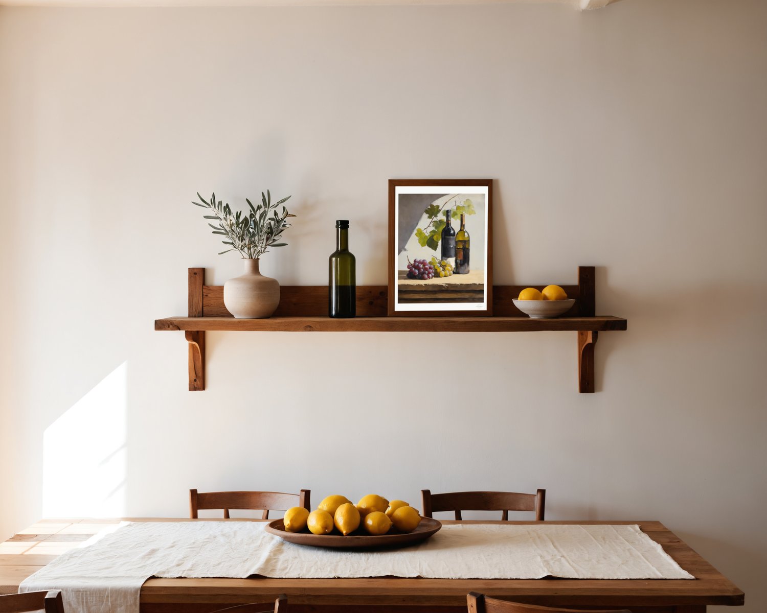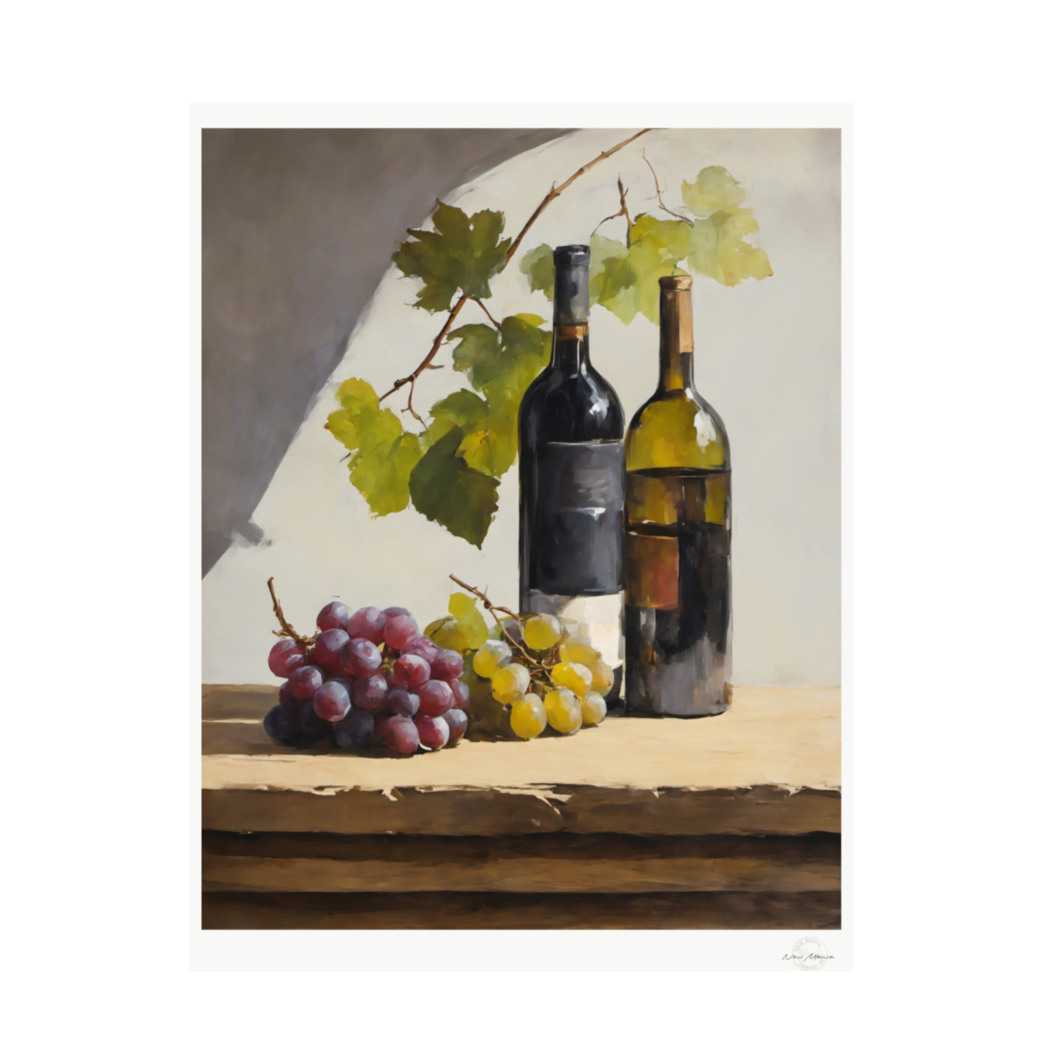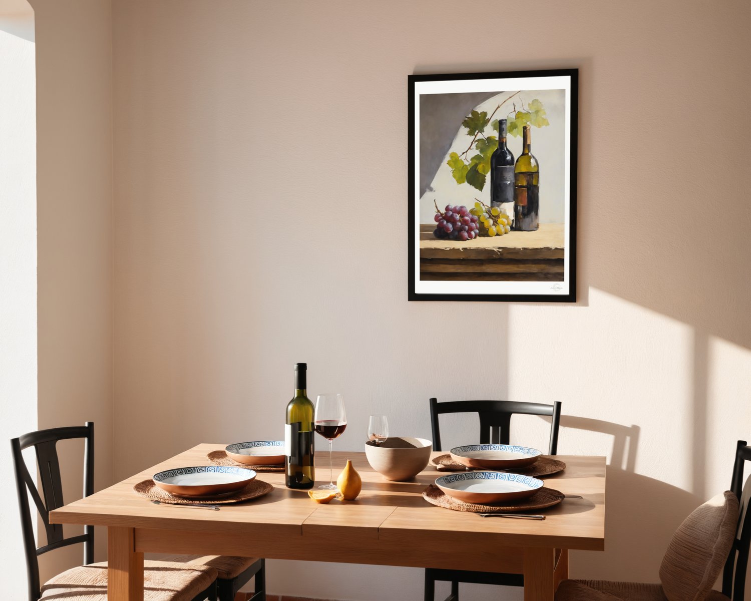 A warm still life composition with wine and grapes, captured in soft natural light. A balanced piece that brings subtle color and calm to kitchen and dining spaces.