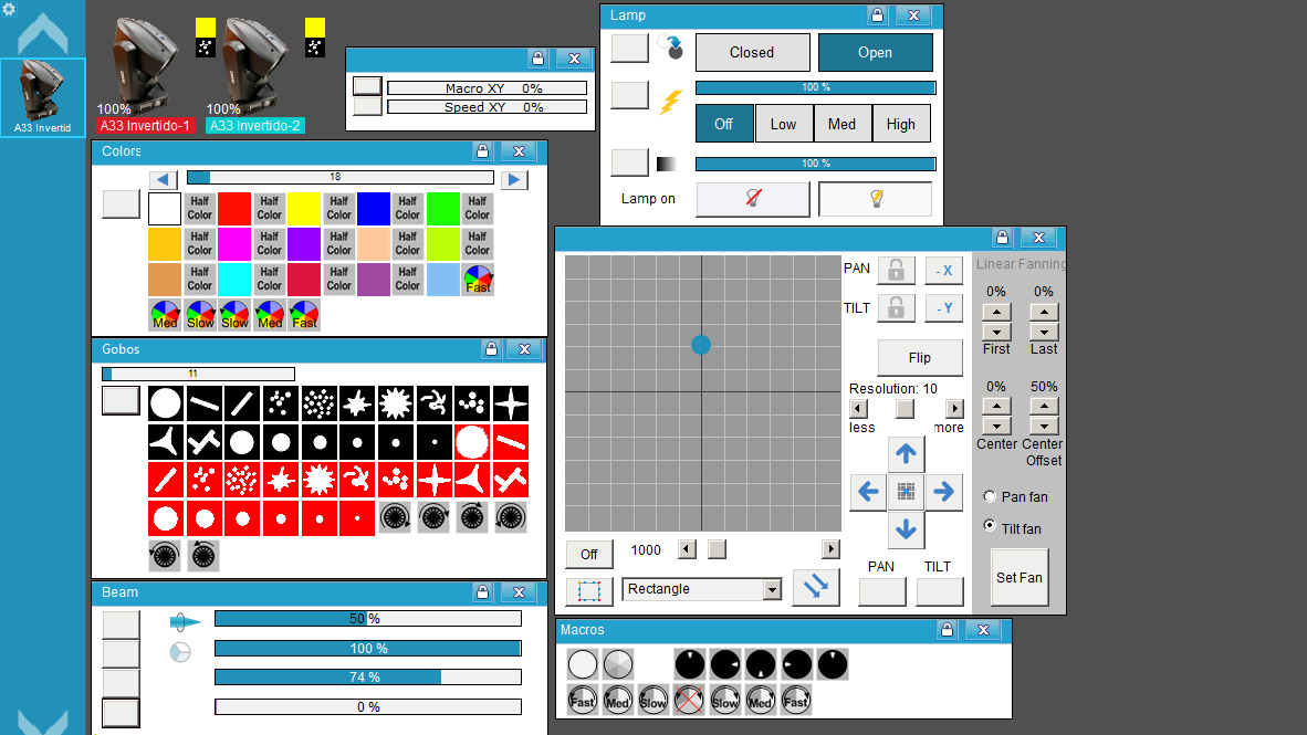 * Verifique, con un Fixture de pruebas (click), que coincidan estos canales: 10 Pan, 12 Tilt, 3 Dimmer, 2 Strobo, 5 Prisma.