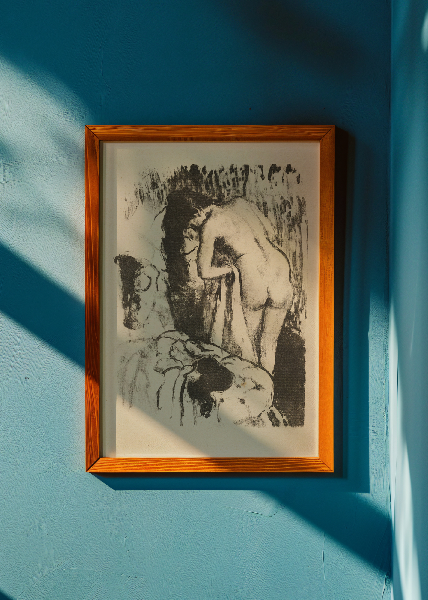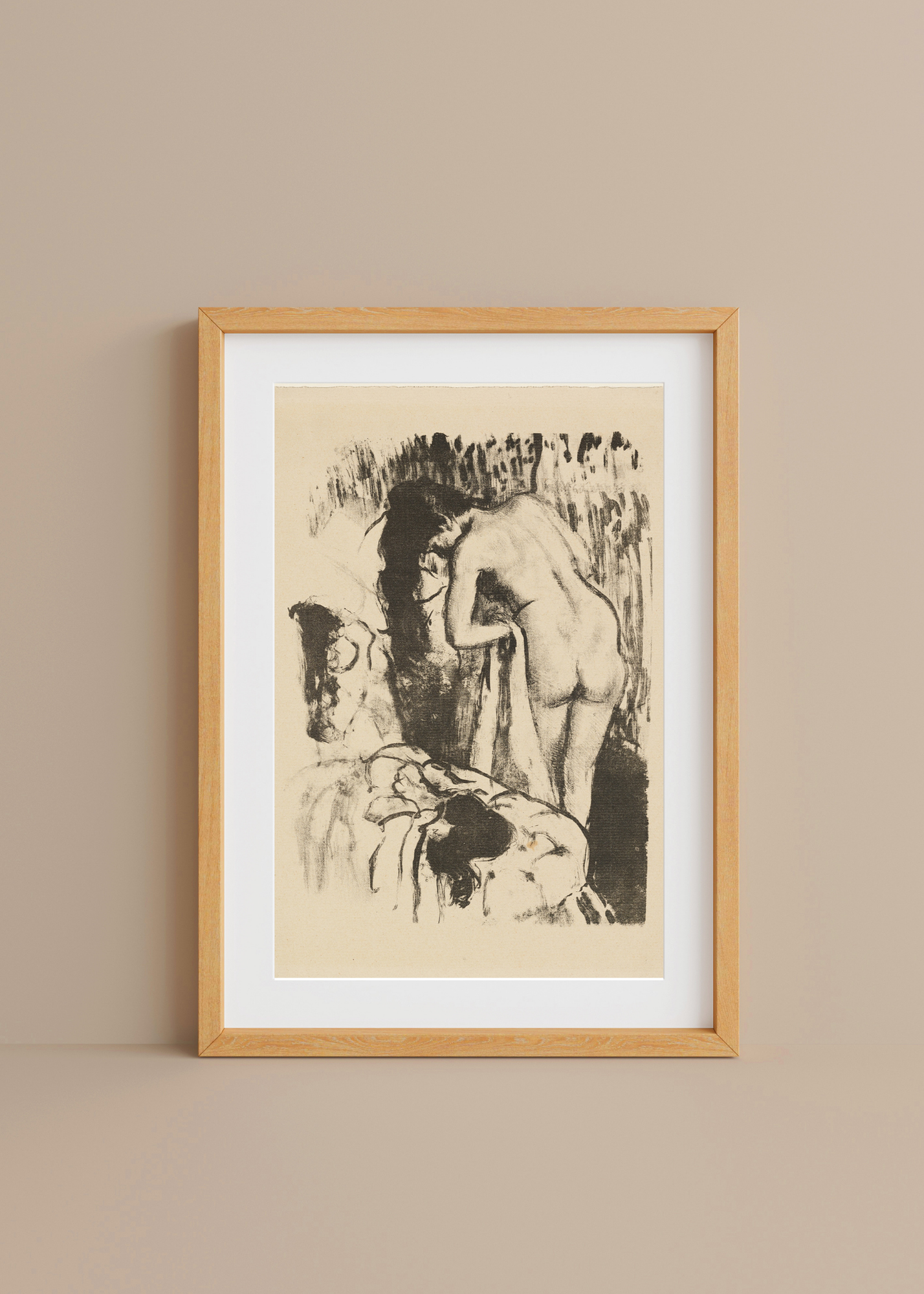 Woman Standing, Drying Herself— Rendered delicately and with confident strokes, Degas’ Woman Standing, Drying Herself is a moment of intimacy caught in quiet reverence. The figure, turned inward, stands in an unguarded pose, one arm lifted in the everyday ritual of drying her skin. There is no gaze toward the viewer, no performance—only the quiet rhythm of solitude and care. Her form, softly contoured and bathed in warm, natural tones, radiates a gentle vulnerability. The background is nearly abstract, allowing her presence to anchor the scene. In this glimpse behind the veil of daily life, Degas captures the beauty of a moment not meant to be seen—tender, personal, and human.