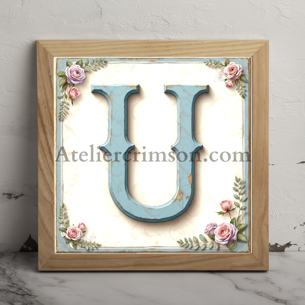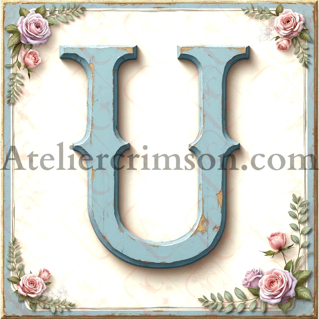 The letter U shabby chic blue a work of art in soft pastel blue. These elegant characters, reminiscent of weathered painted wood, stand out against a delicate off-white background with subtle floral accents. Perfect for vintage-inspired home decor, DIY projects, or creating unique, personalized gifts with a touch of timeless elegance.