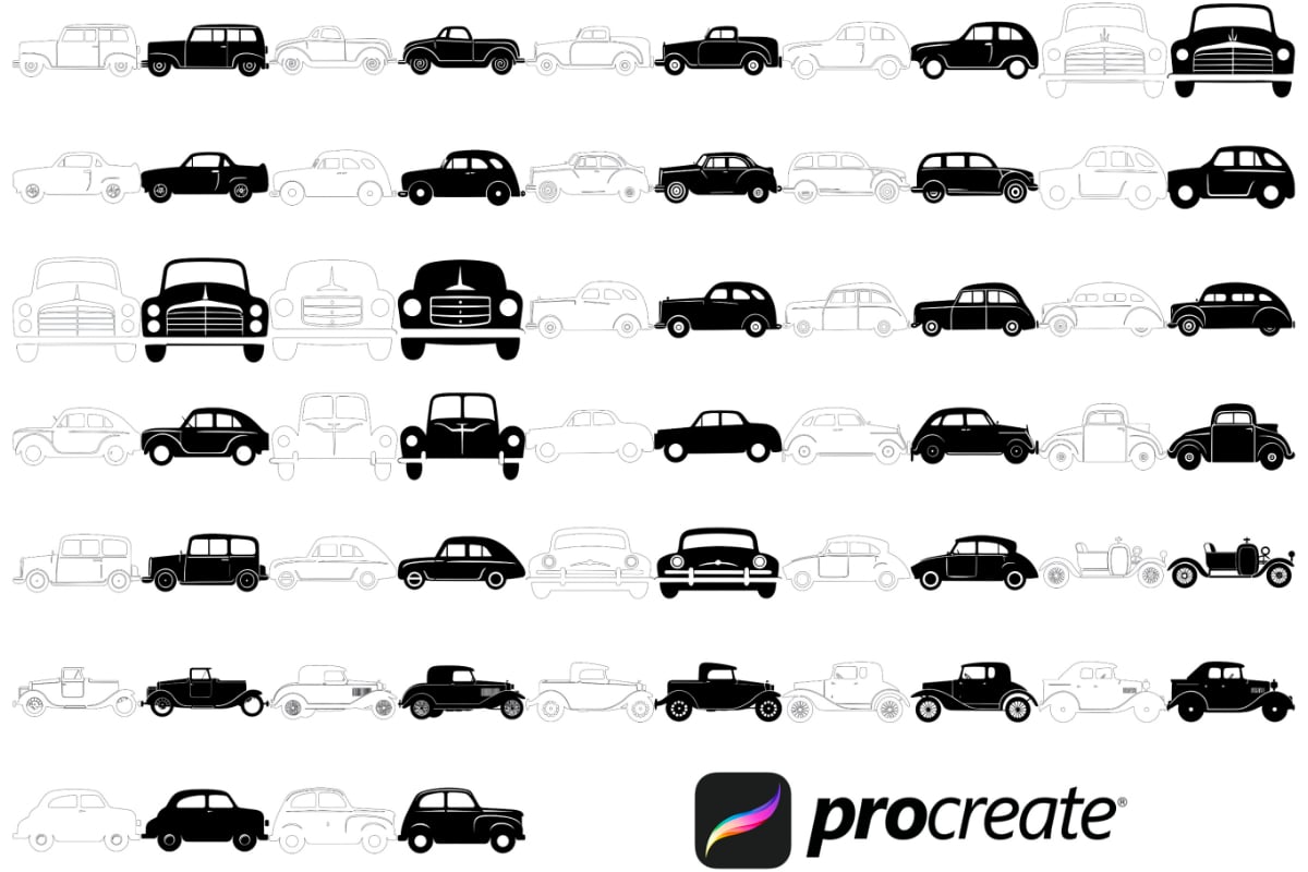 Cars Outlines & Silhouettes Set 3 Procreate Brush Stamps, 64 Car Stamps