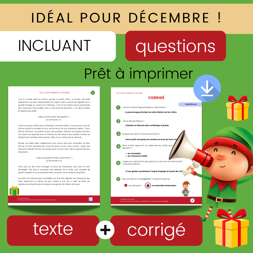 Fête de Noël — Lecture 2e cycle : Les lutins perdent le rythme (395 mots) | 9 questions + corrigé par dimensions