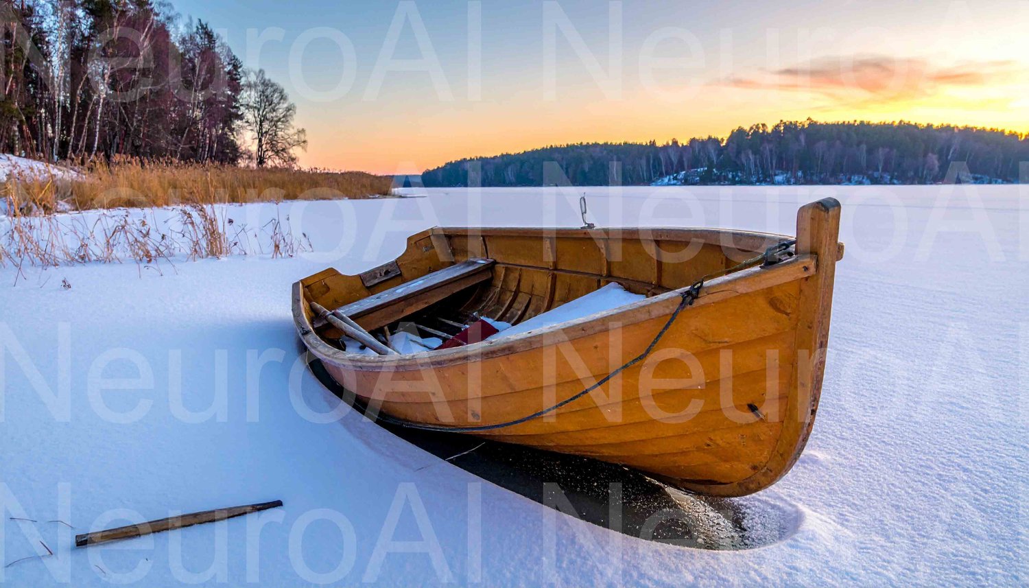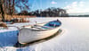 Rowboat rests peacefully on frozen lake shoreline