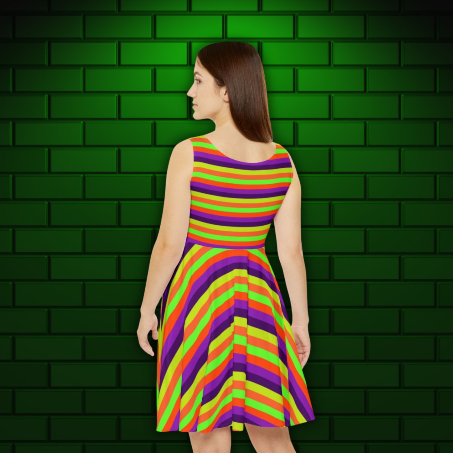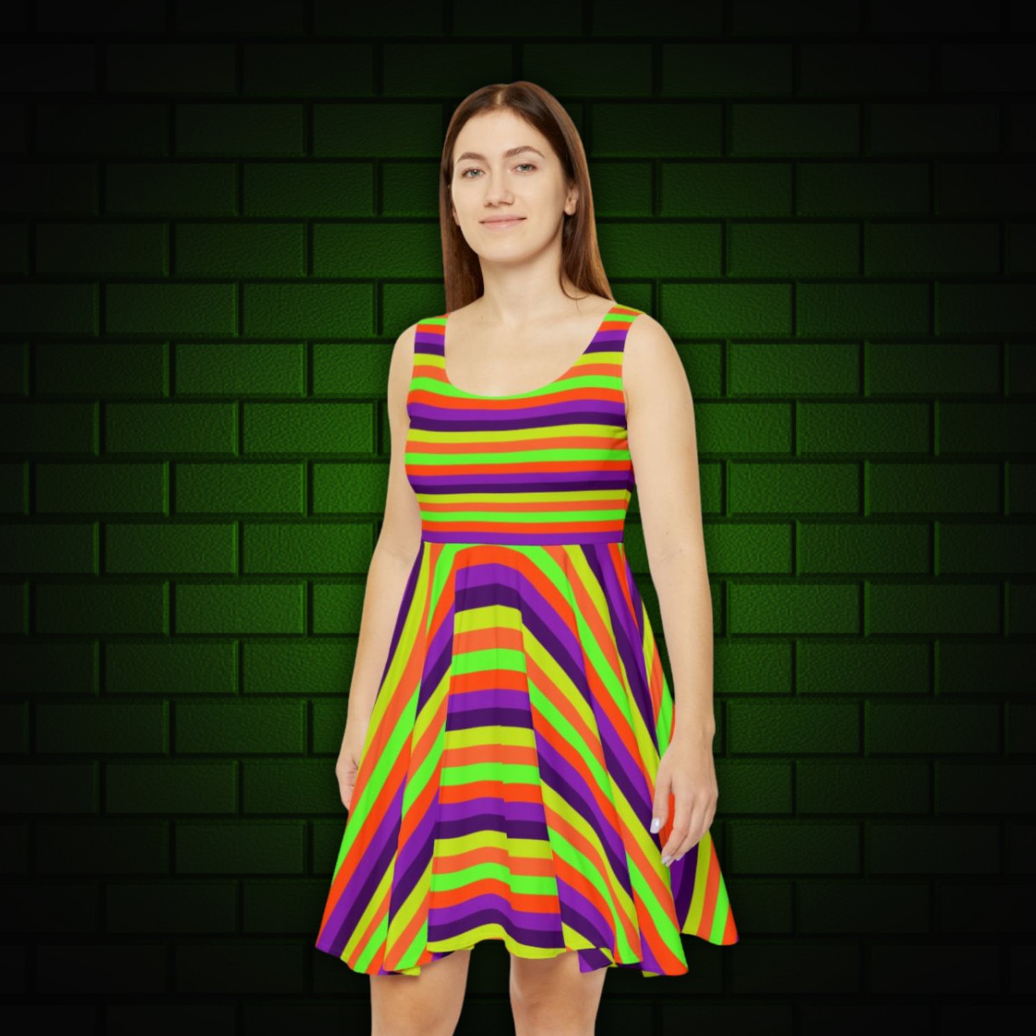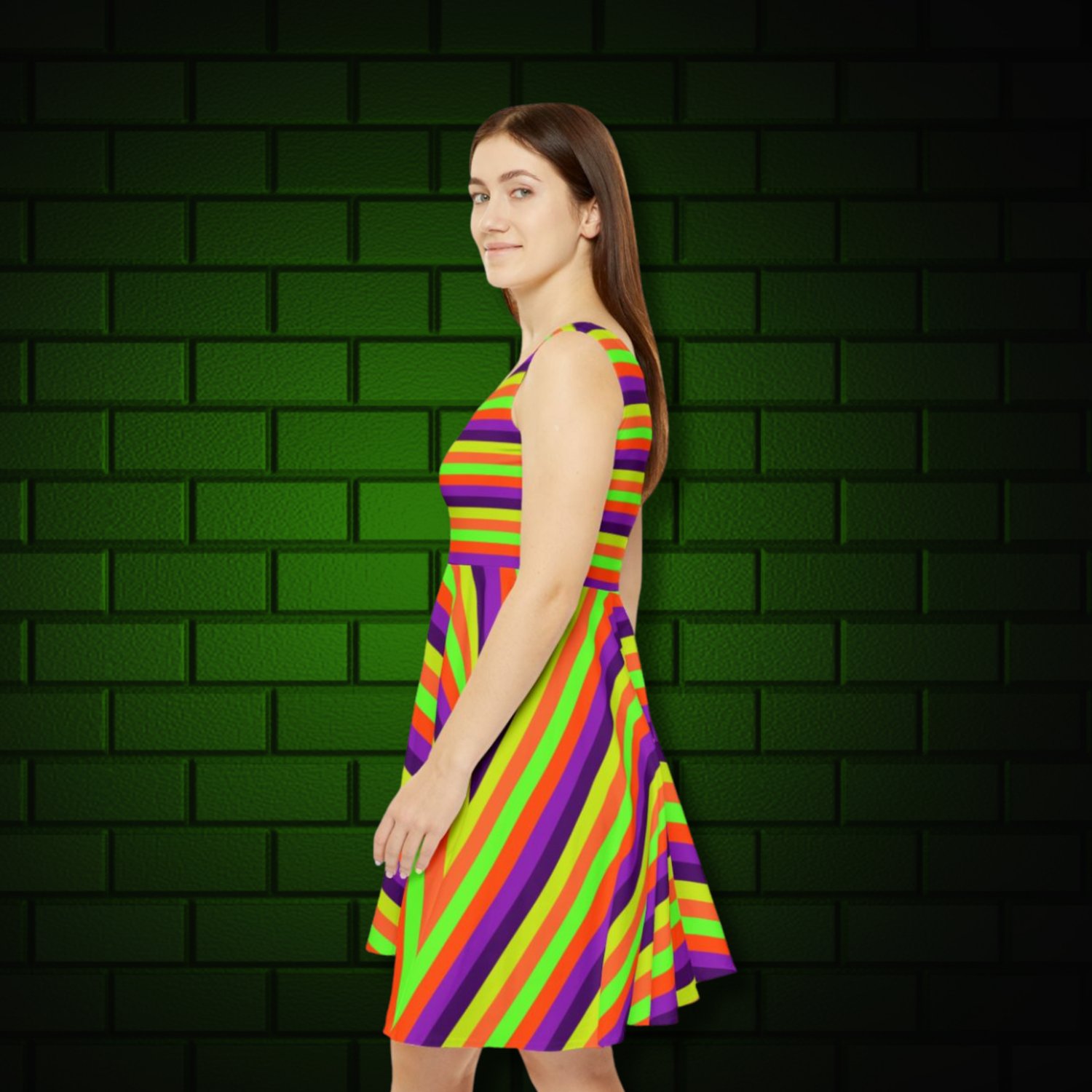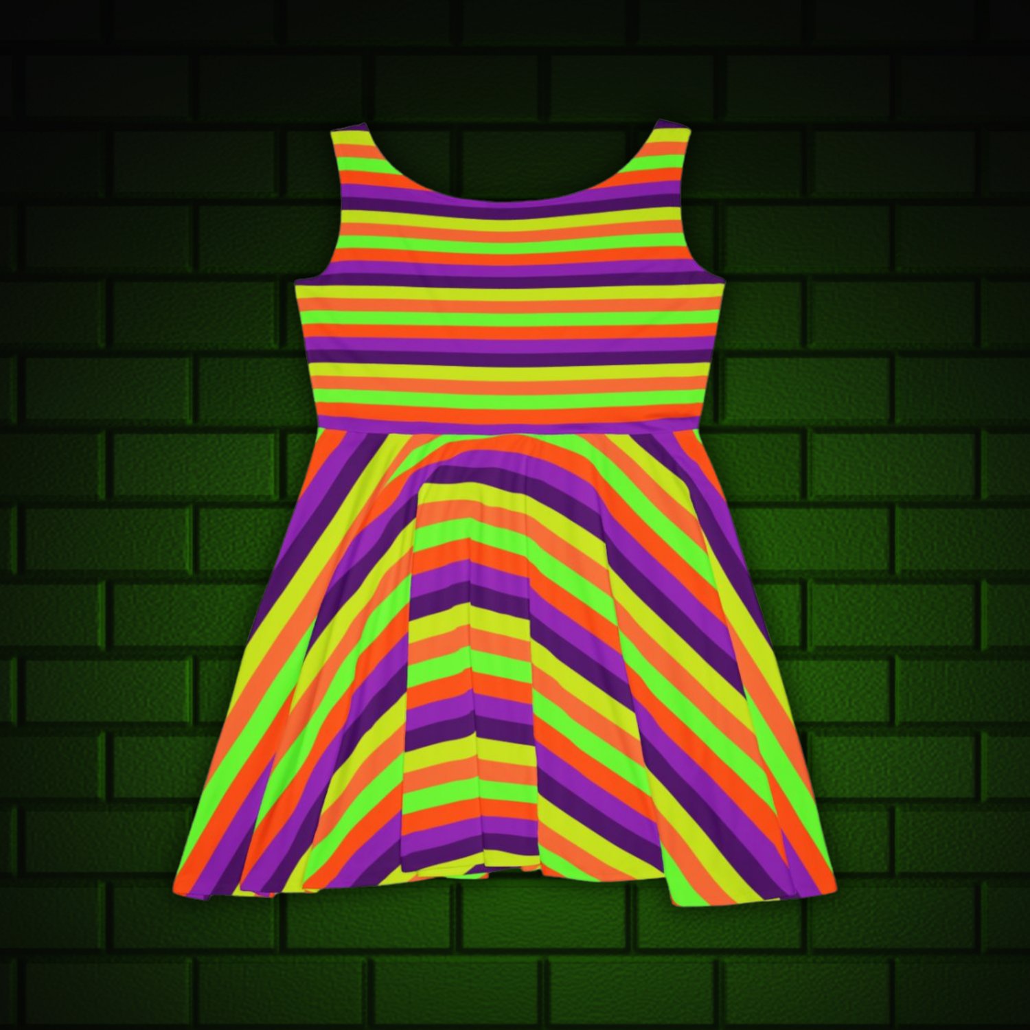 Turn up the color with this Orange, Purple, Yellow & Neon Green Skater Dress, made for those who love to stand out. The high-cut neckline and asymmetrical skirt give you a flattering, playful silhouette, while the neon-inspired palette makes this dress pop in any crowd. Perfect for festivals, parties, Halloween events, or everyday bold style, this dress blends comfort with show-stopping design.