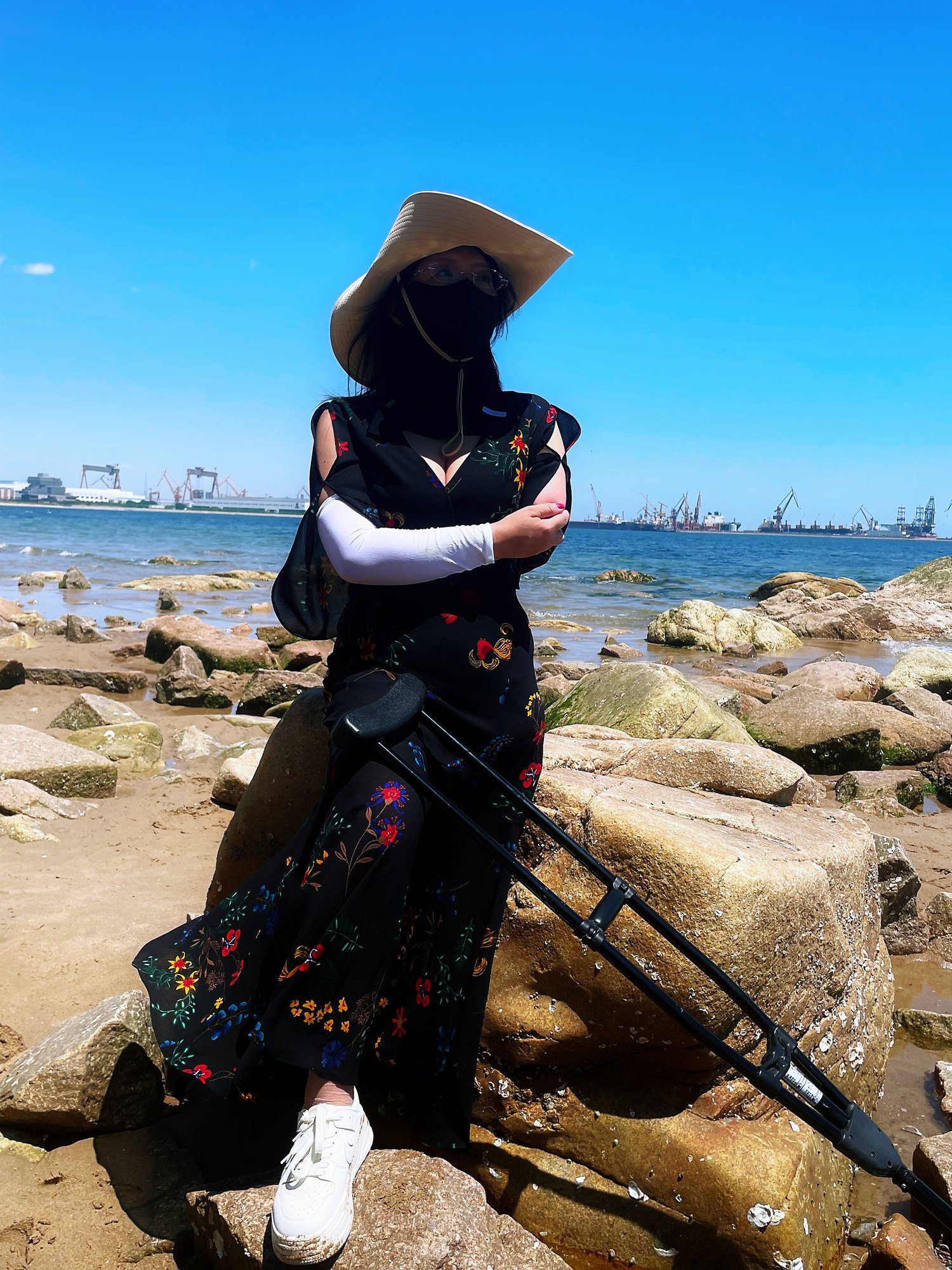 Lanzi applied a thick layer of sunscreen and wore a black mask to prevent sun damage.
