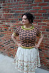 This is a pattern for a Raglan tee, worked from the top down and in the round, using the stranded knitting technique. (Raglan shaping is fully charted.)