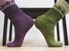 - designed for a set of 5 gradient dyed miniskeins of fingering weight (approximately 400-420 m / 100 g) yarns: for sizes S and M/L 20 grams of each colour is adequate but for size XL you may need more of heel and toe colours (or you can change the colour whenever you run out of yarn)