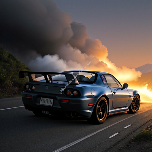 This cinematic moment captures the legendary Mazda RX-7 mid-slide, carving into the horizon as smoke, fire, and sunset melt together. With its iconic round tails glowing and that wide wing slicing the skyline, this AI-rendered masterpiece is all about attitude, motion, and raw JDM soul.