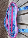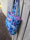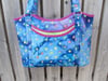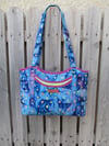 The exterior is a blue batik fabric in 100% cotton fabric, accented with a lime green cotton batik fabric and hot pink cotton fabric. The lining of the bag is a hand dyed cotton fabric with some of the same blue batik fabric from the exterior as an accent. Stabilizers to keep the bag's shape are added too. And a bit of metal hardware add a bit of bling to the look. It truly is one gorgeous and yet functional bag!