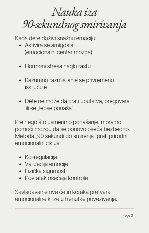 Ovaj kratki, praktični vodič zasnovan na neuronauci i emocionalnoj povezanosti pokazuje vam kako da u teškim trenucima ostanete mirni, prisutni i efikasni — čak i kada je dete preplavljeno emocijama.