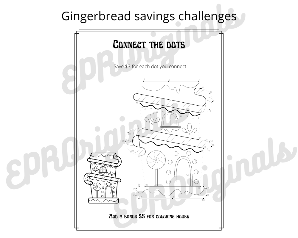Triple the fun for adults or kids. Connect the dot savings challenges offer you 2 options on how to save. You can save the same dollar amount for each dot you connect as labeled. If you want a bigger challenge you can also save the dollar amount of the dot number. This is 1 of 3 sets with a Christmas theme. These 3 savings challenges feature Gingerbread Houses.
